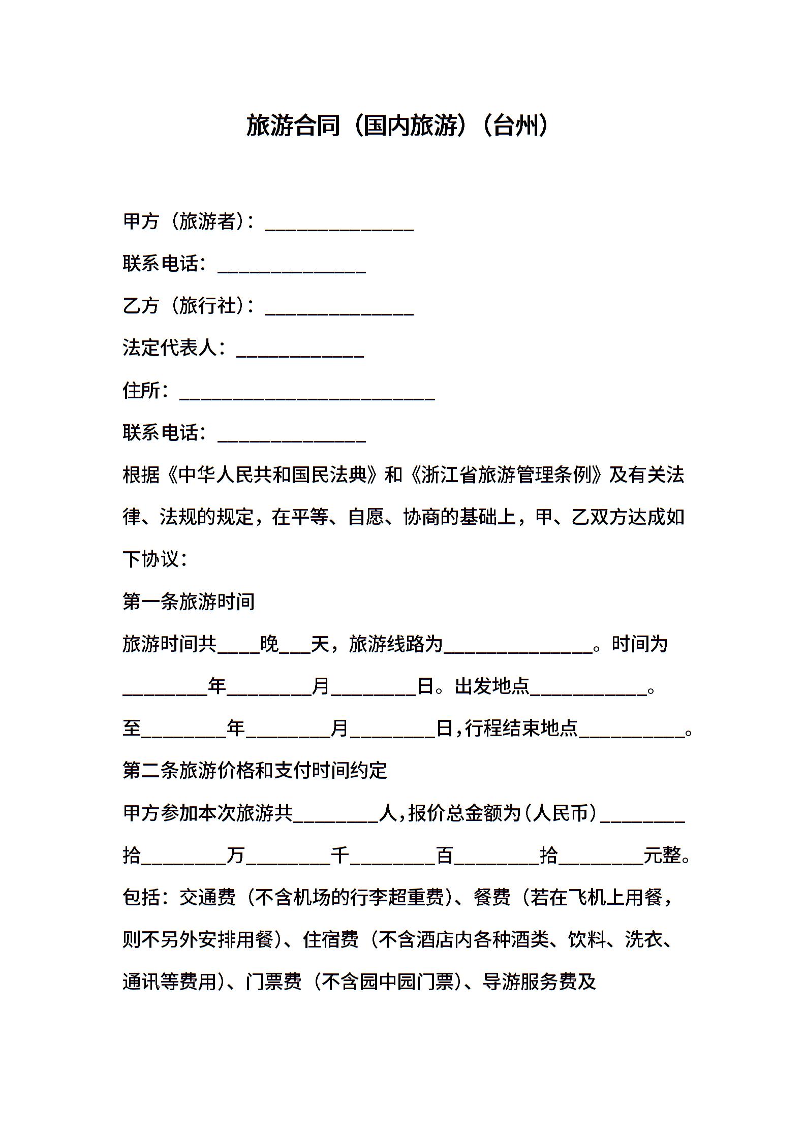 旅游合同(国内旅游)(台州)