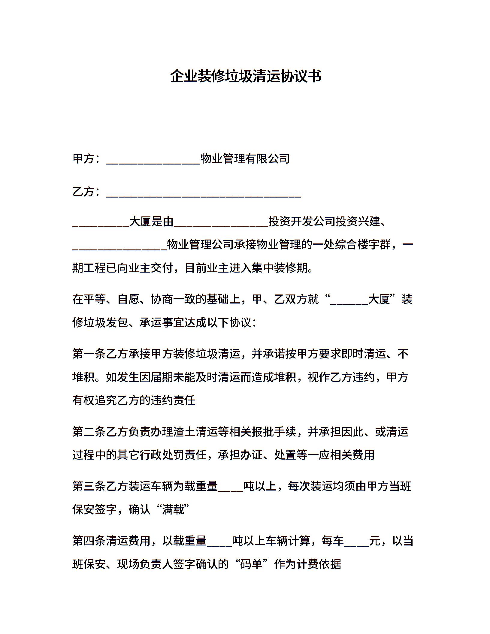 企业装修垃圾清运协议书