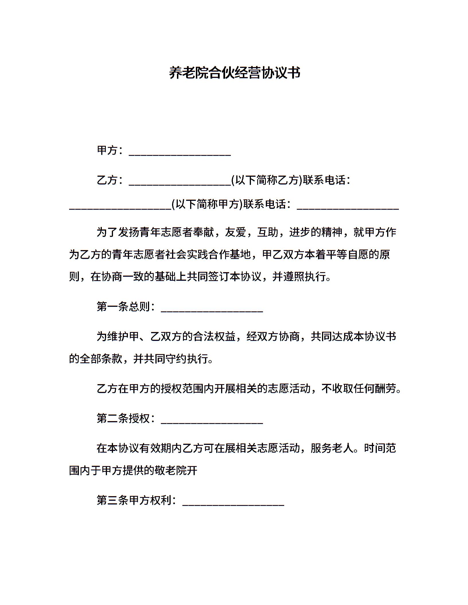 养老院合伙经营协议书