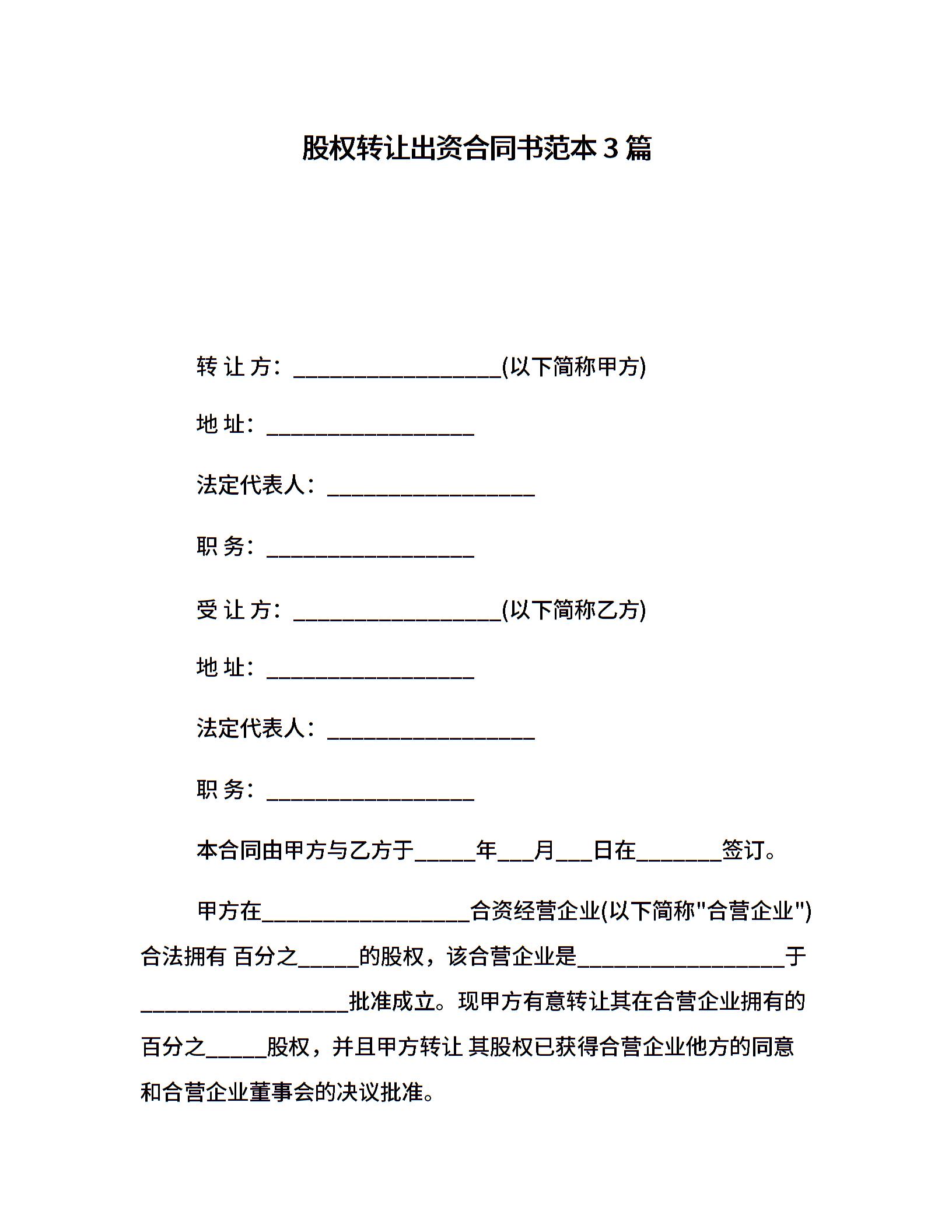 股权转让出资合同书范本3篇