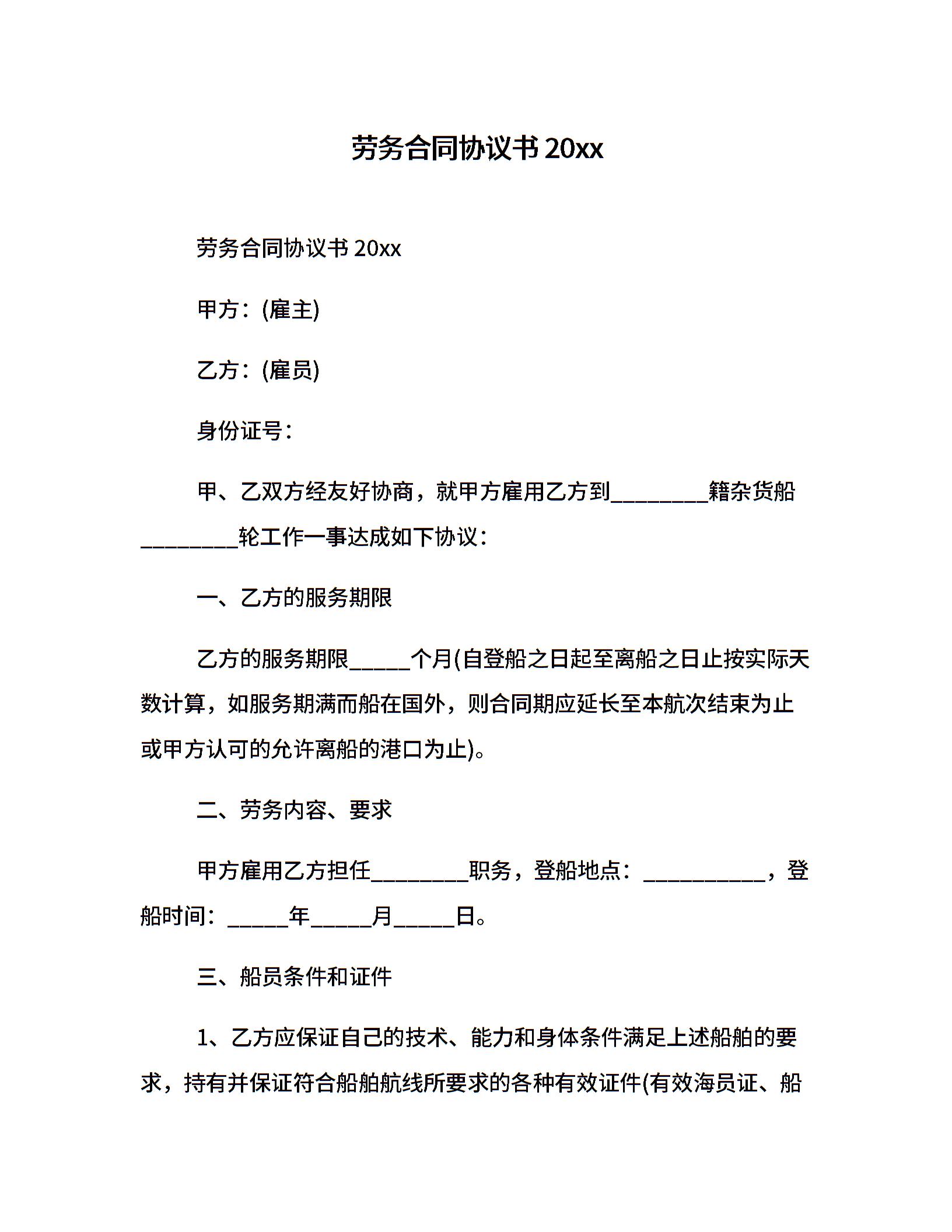 劳务合同协议书20xx