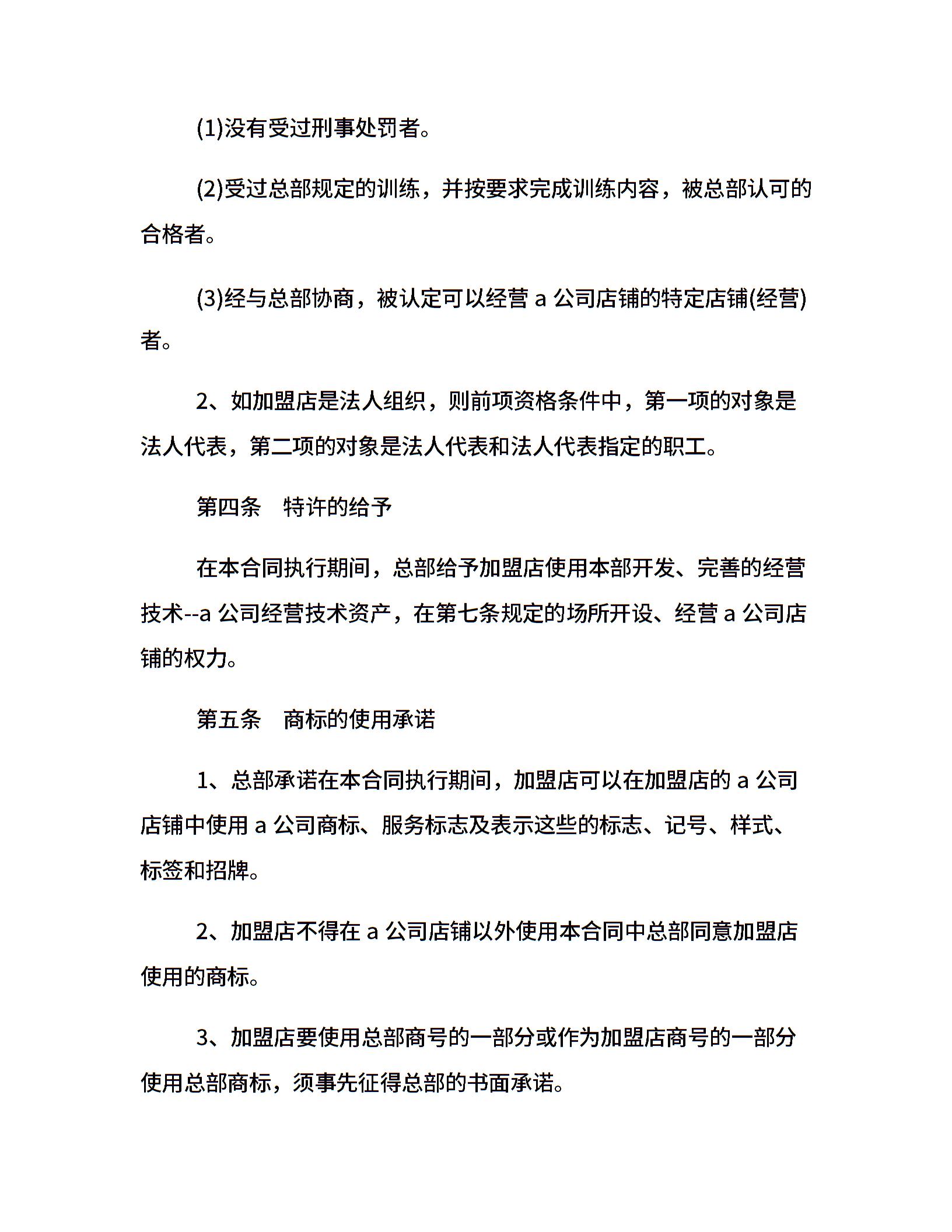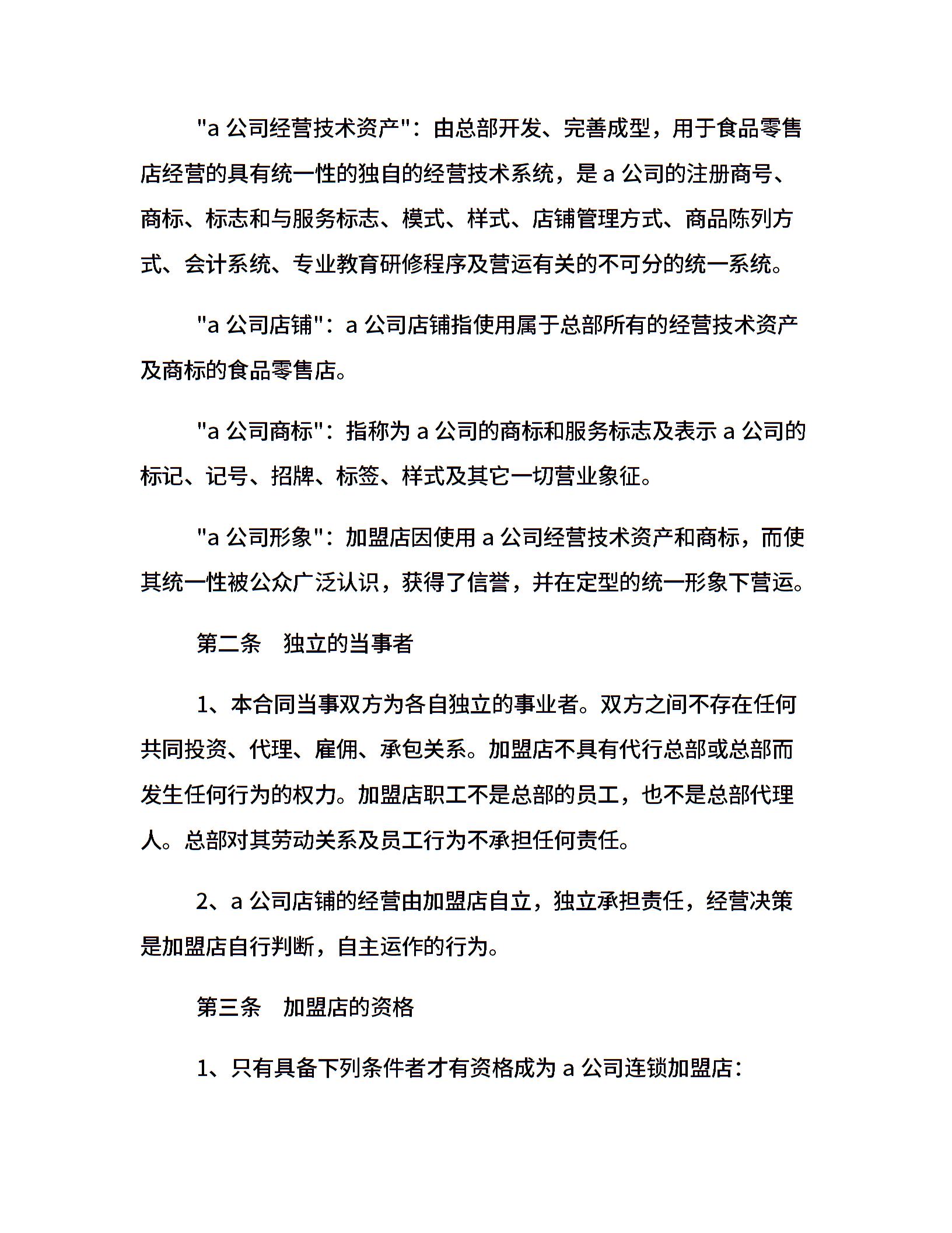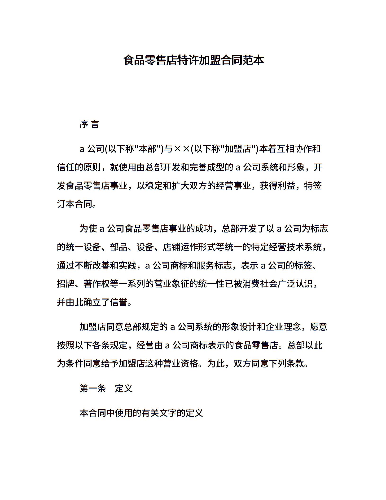 食品零售店特许加盟合同范本