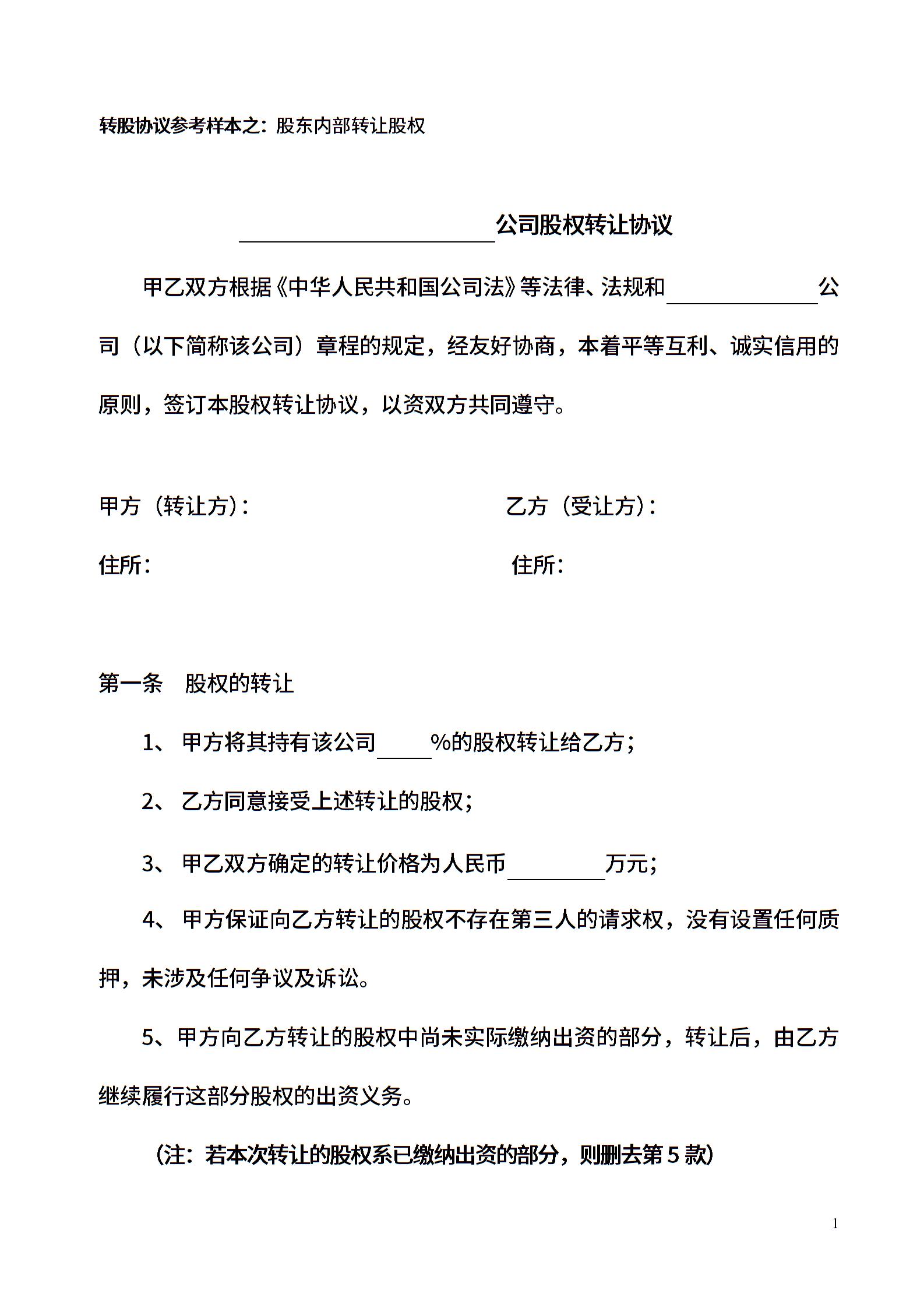 股权转让协议范本(对内转让)