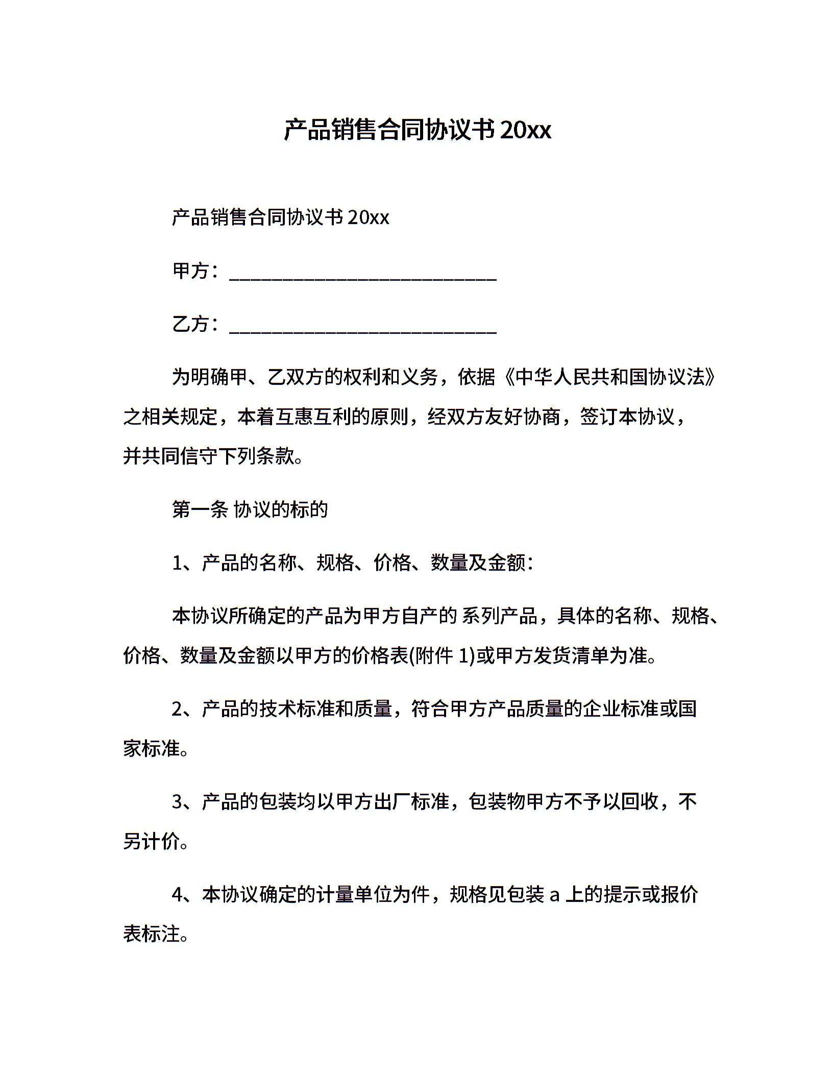 产品销售合同协议书20xx
