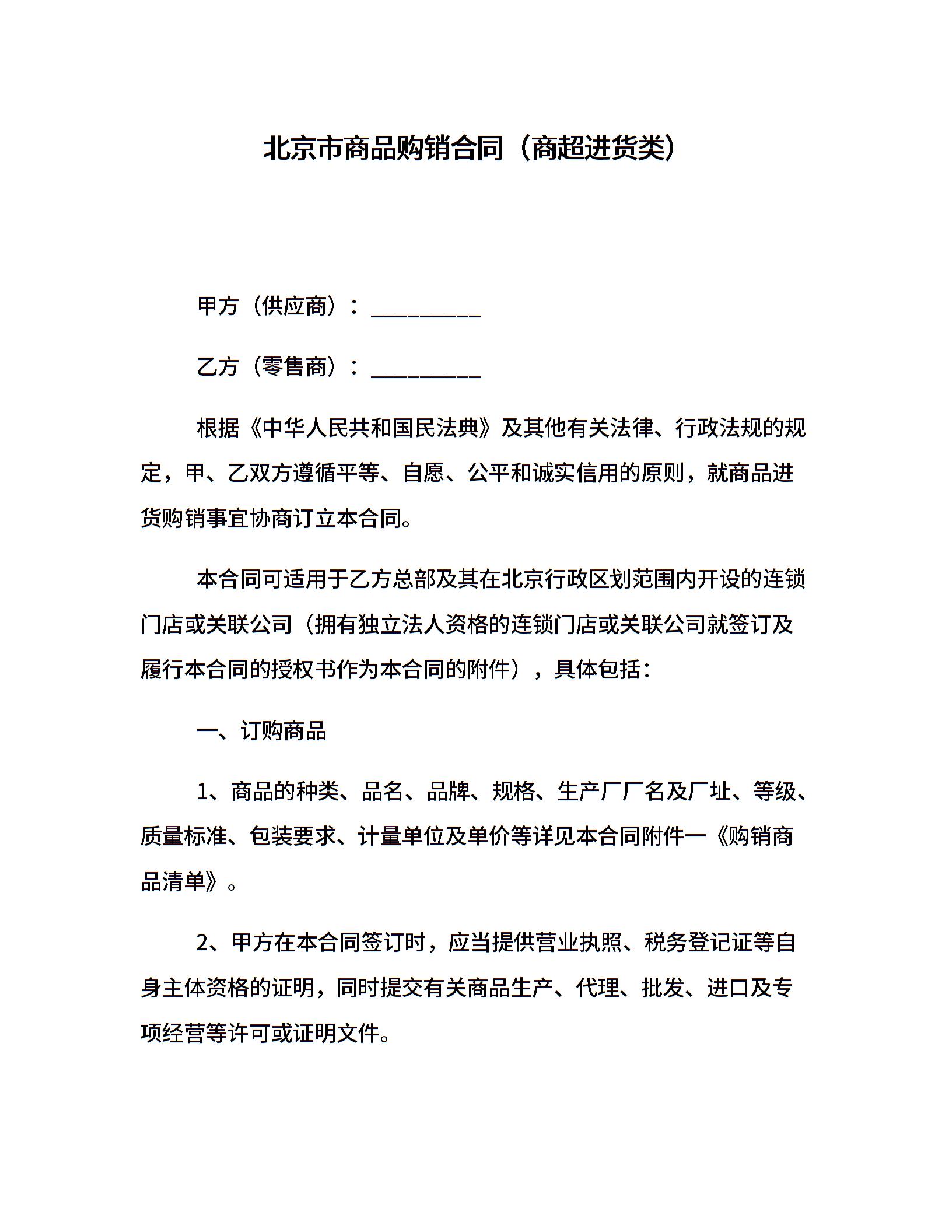 北京市商品购销合同(商超进货类)