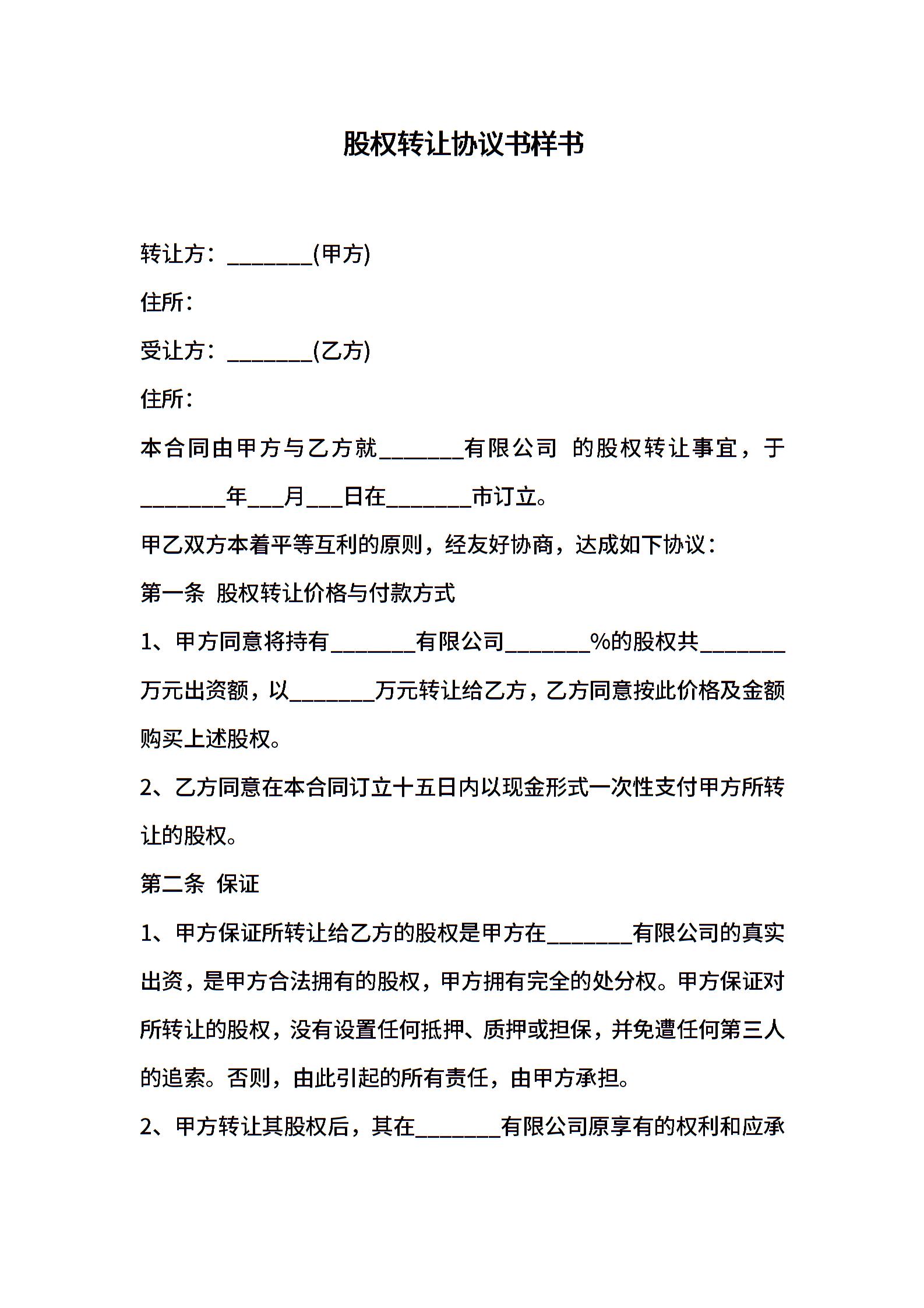 股权转让协议书样书
