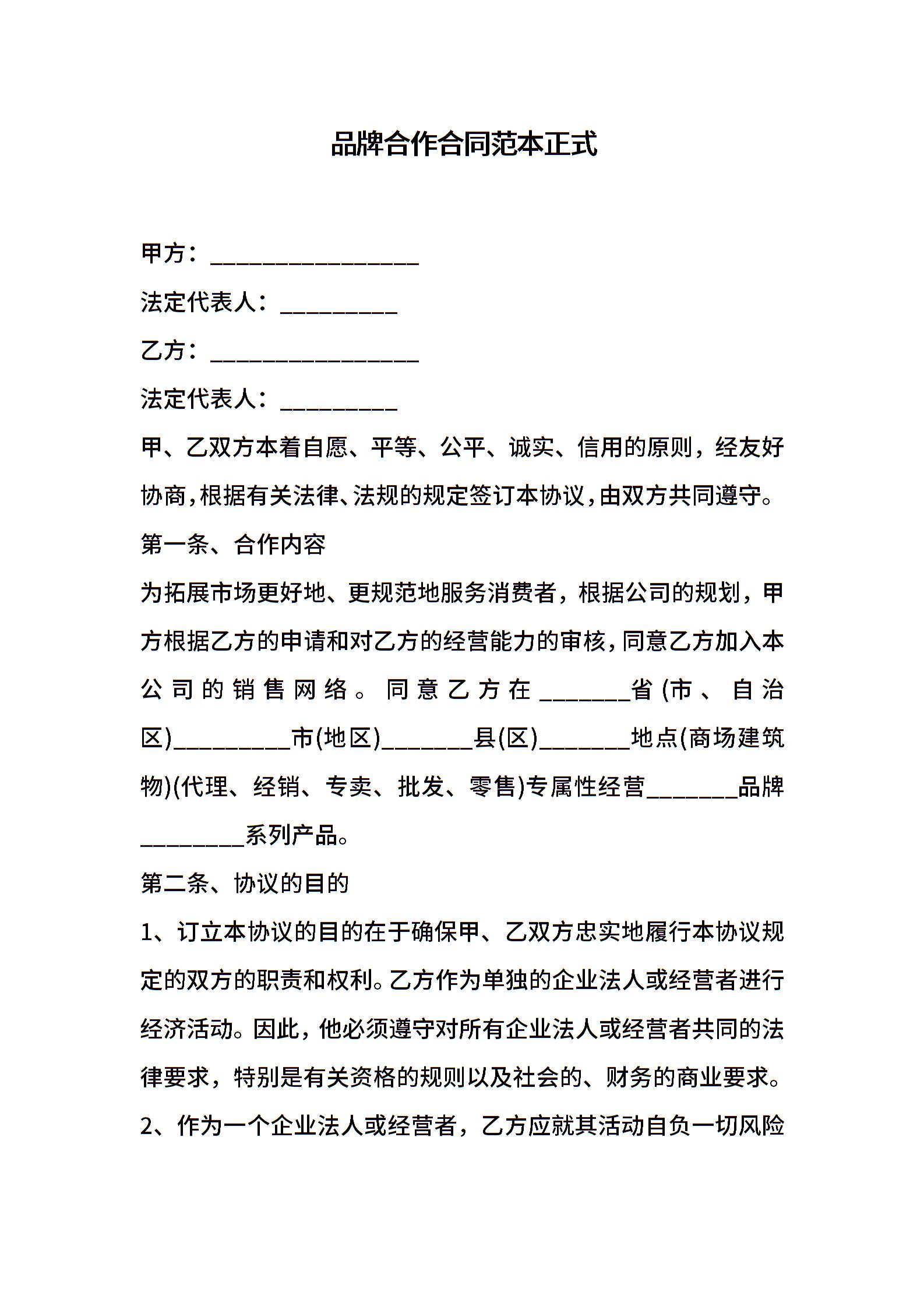 品牌合作合同范本正式