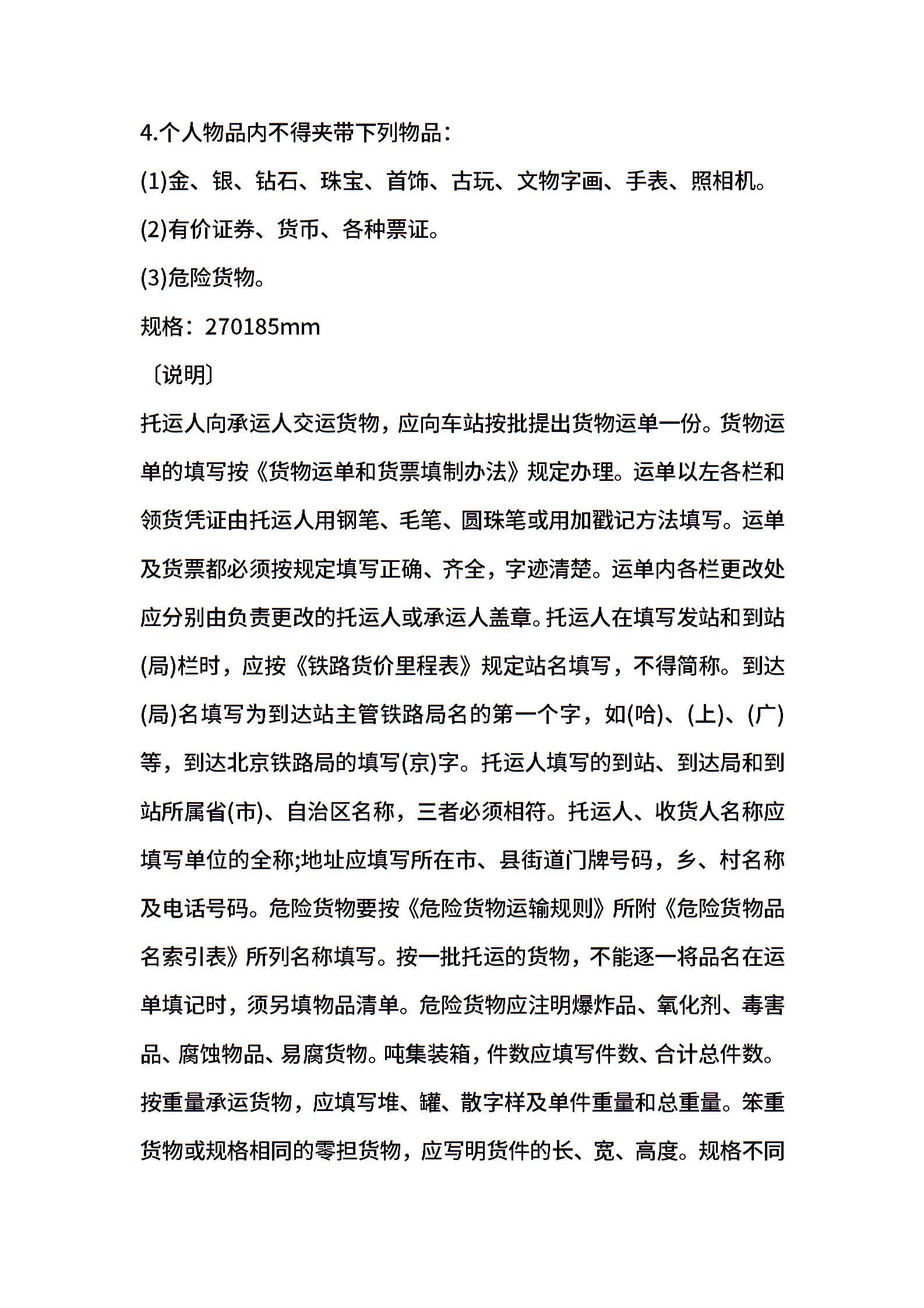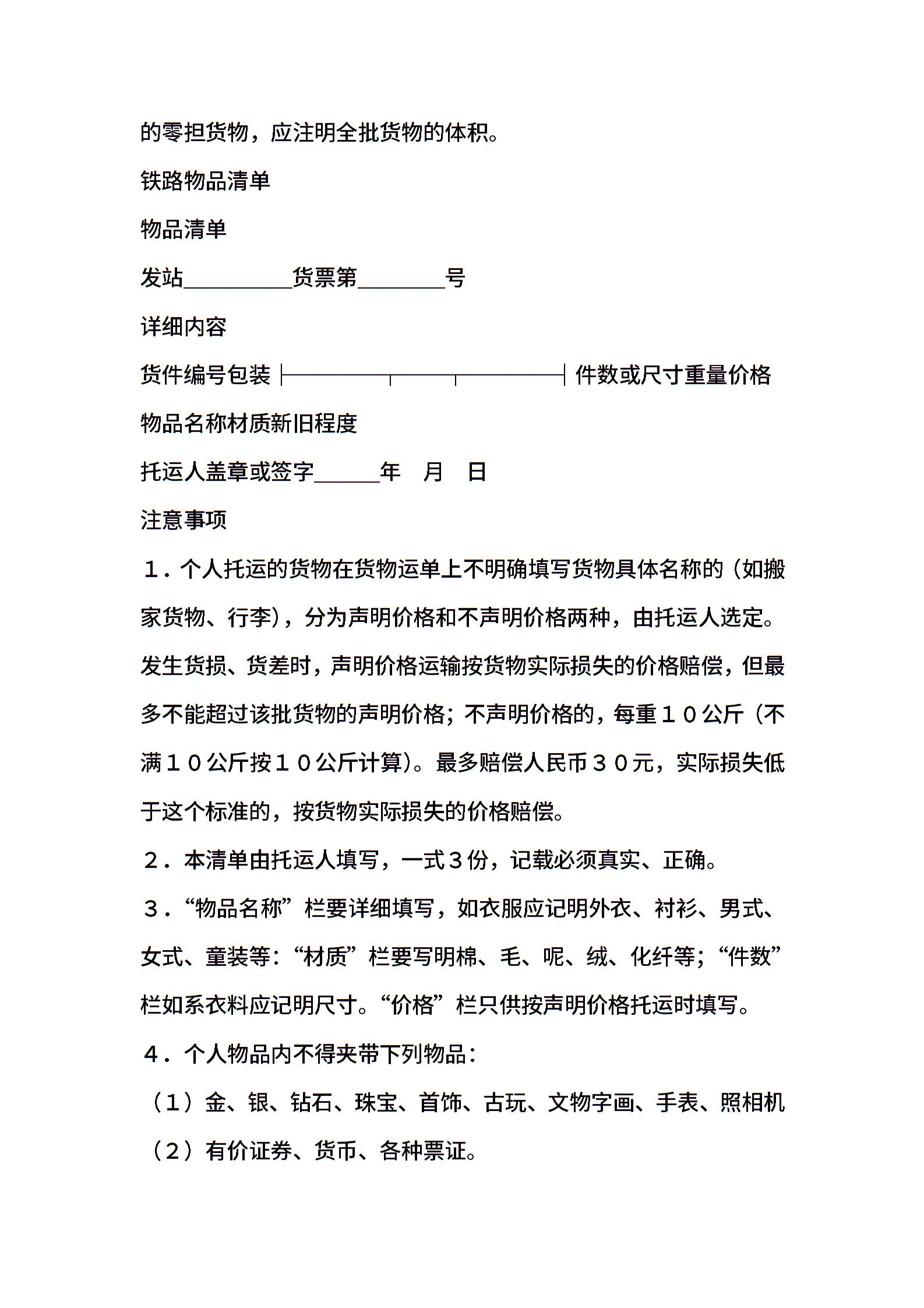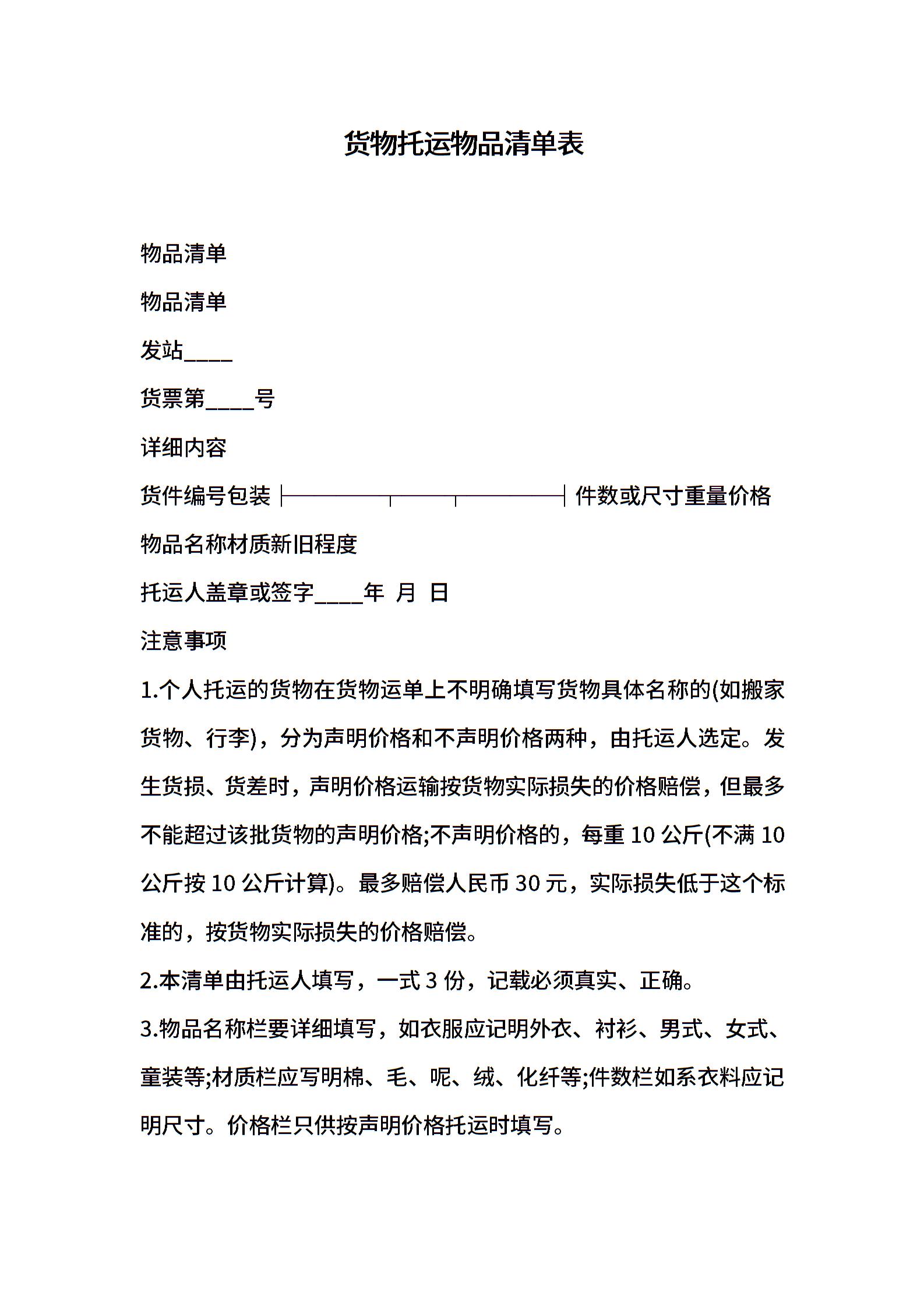 货物托运物品清单表