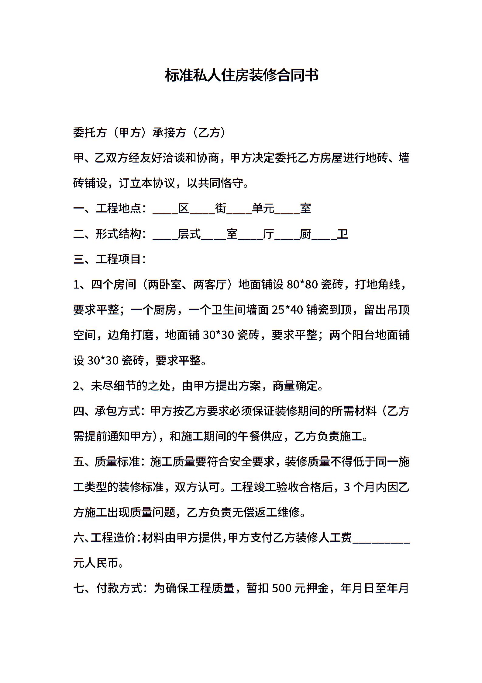 标准私人住房装修合同书