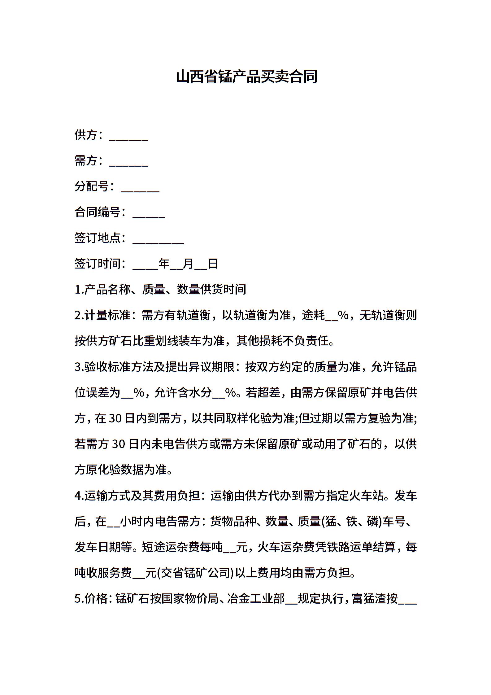 山西省锰产品买卖合同