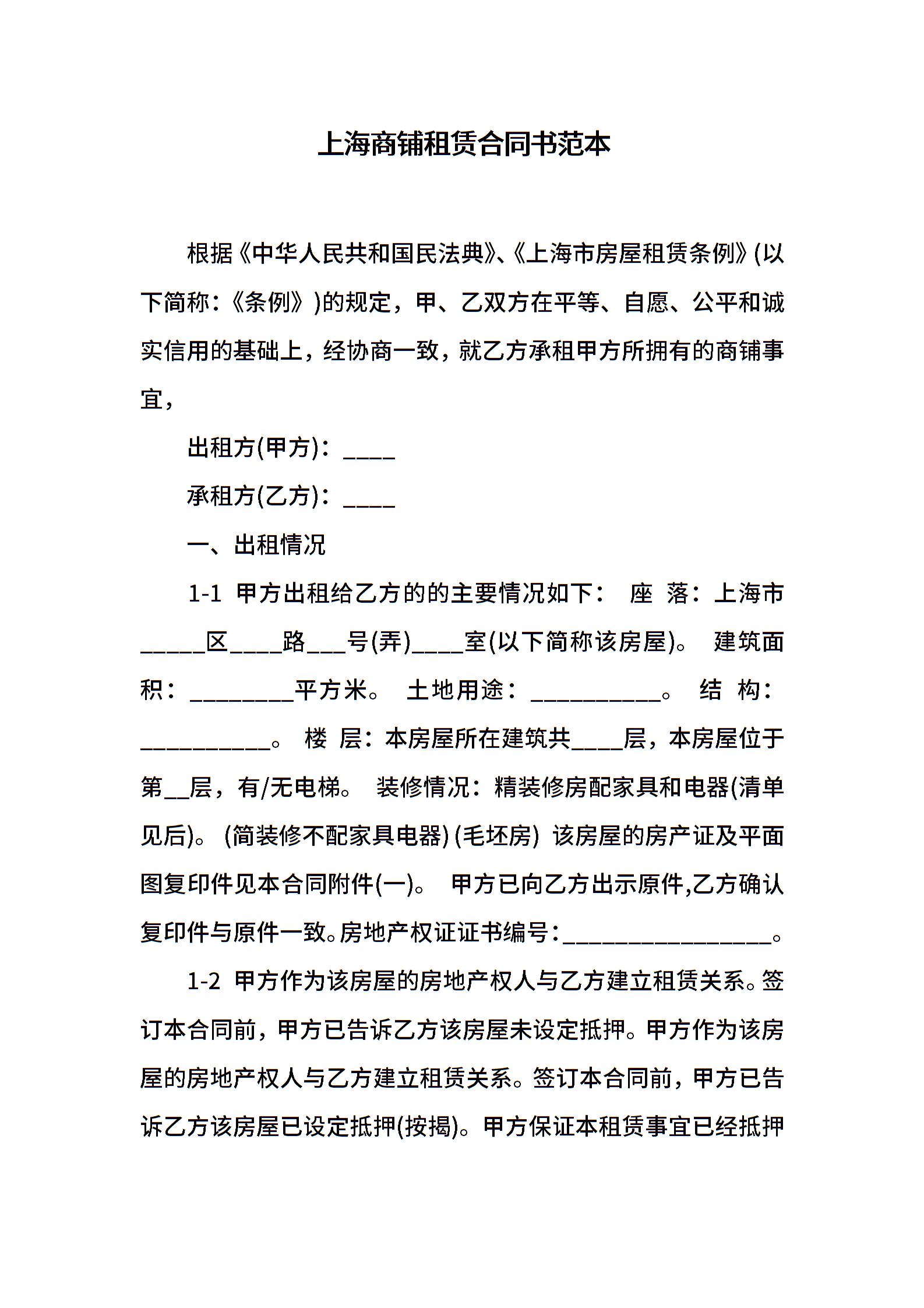 上海商铺租赁合同书范本