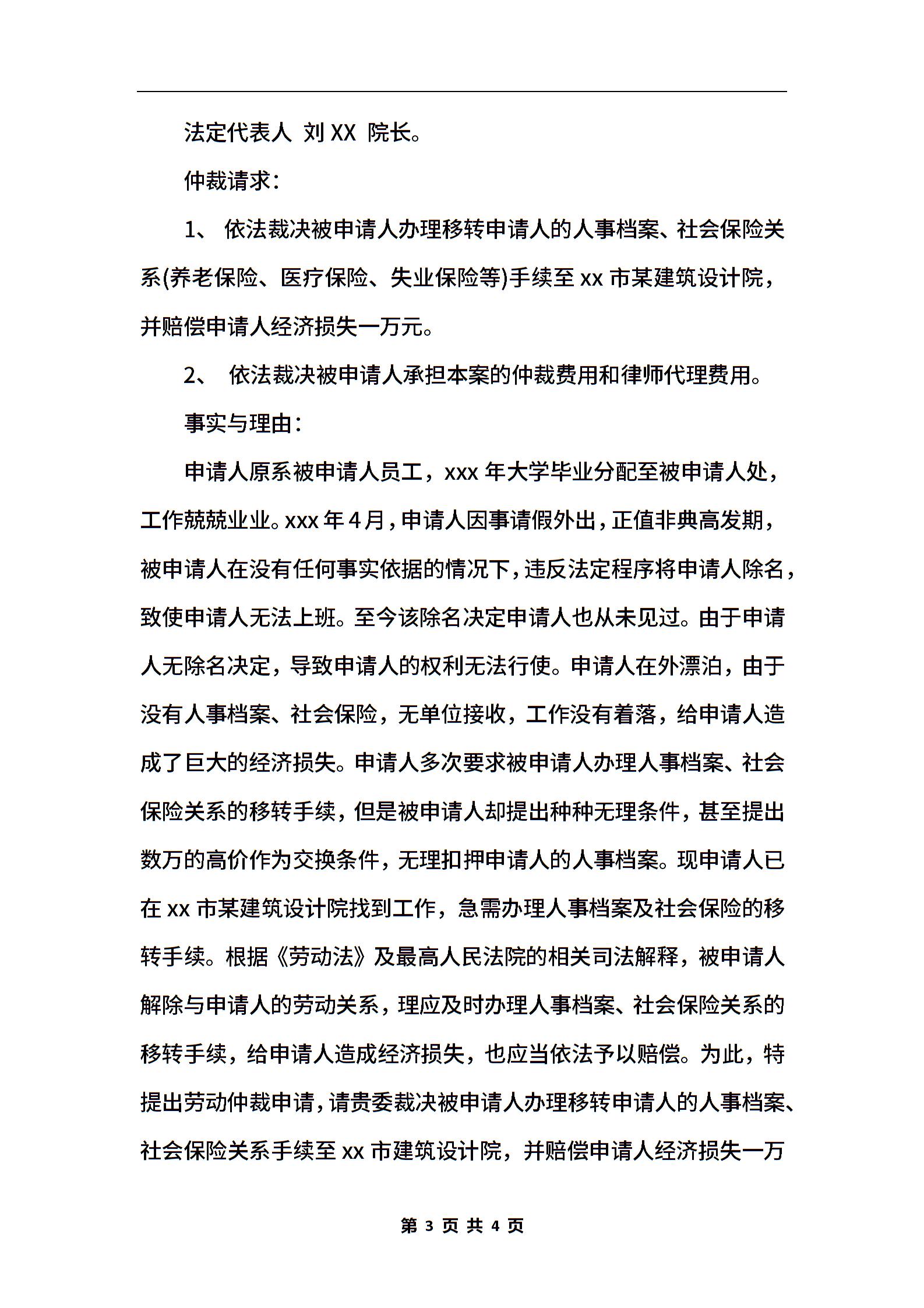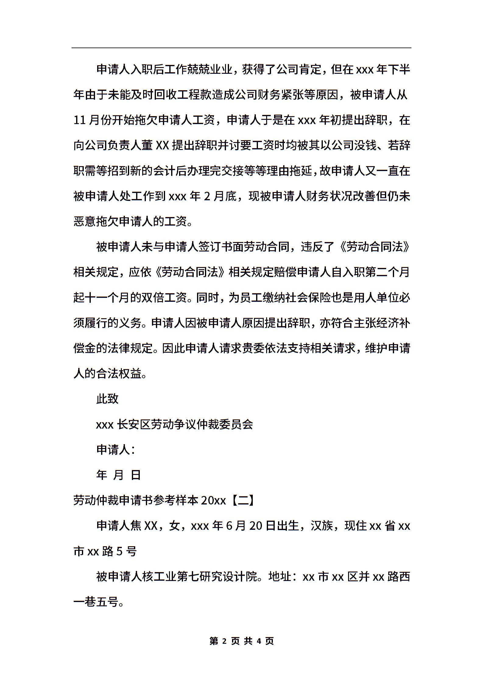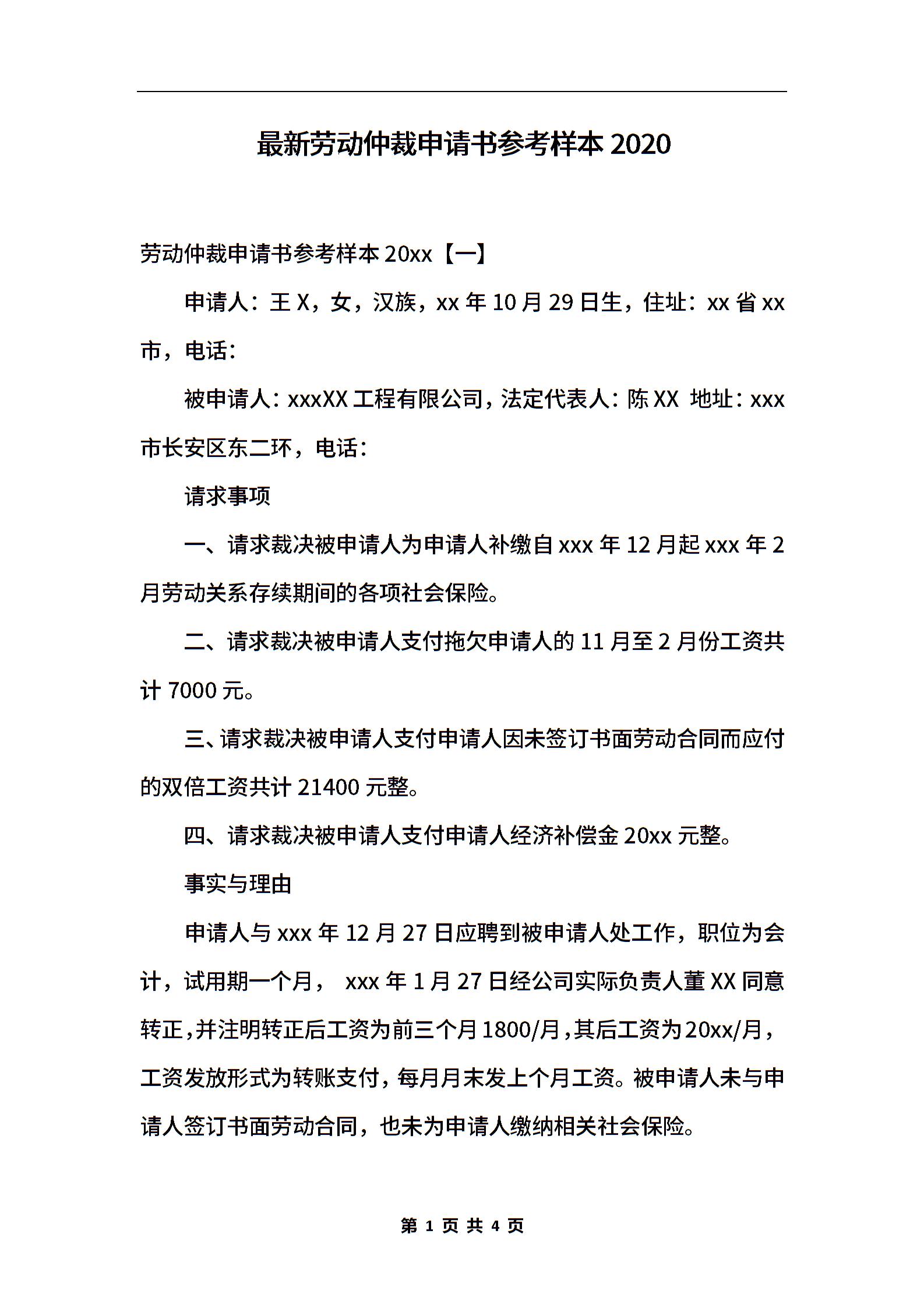 最新劳动仲裁申请书参考样本2020