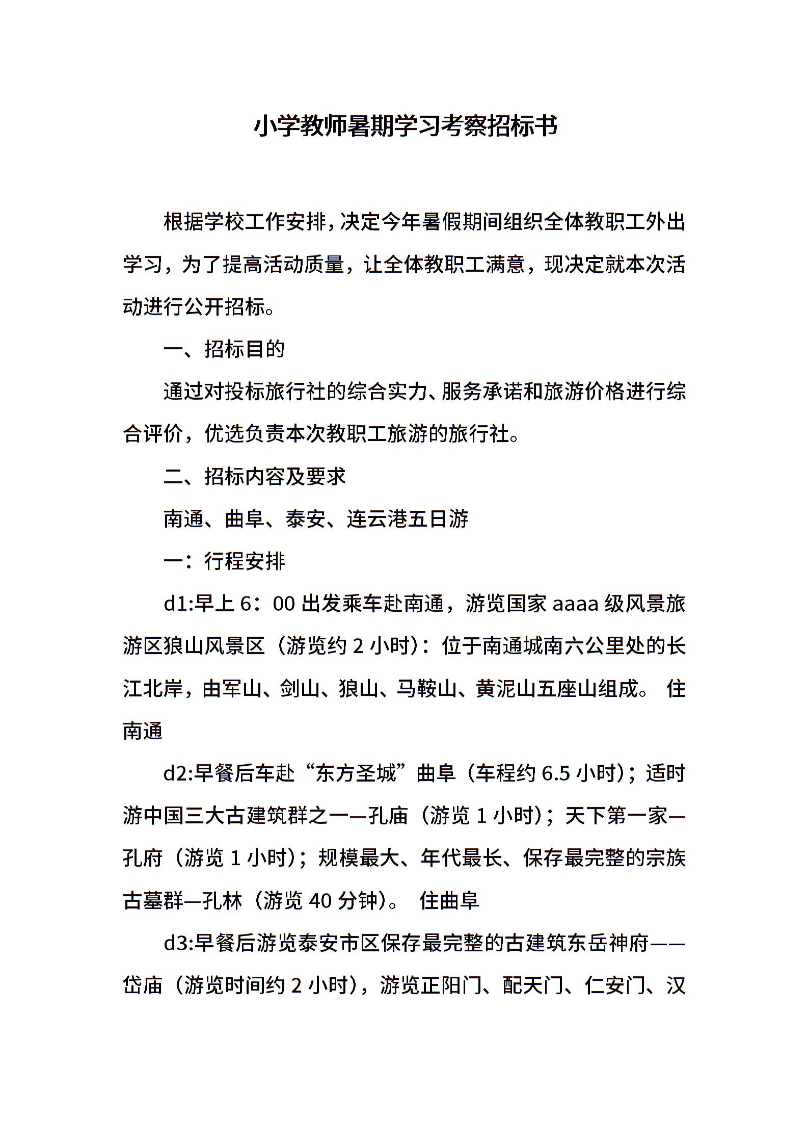 小学教师暑期学习考察招标书