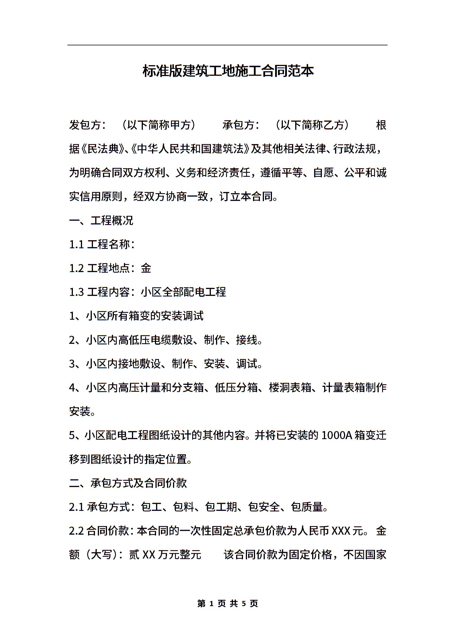 标准版建筑工地施工合同范本