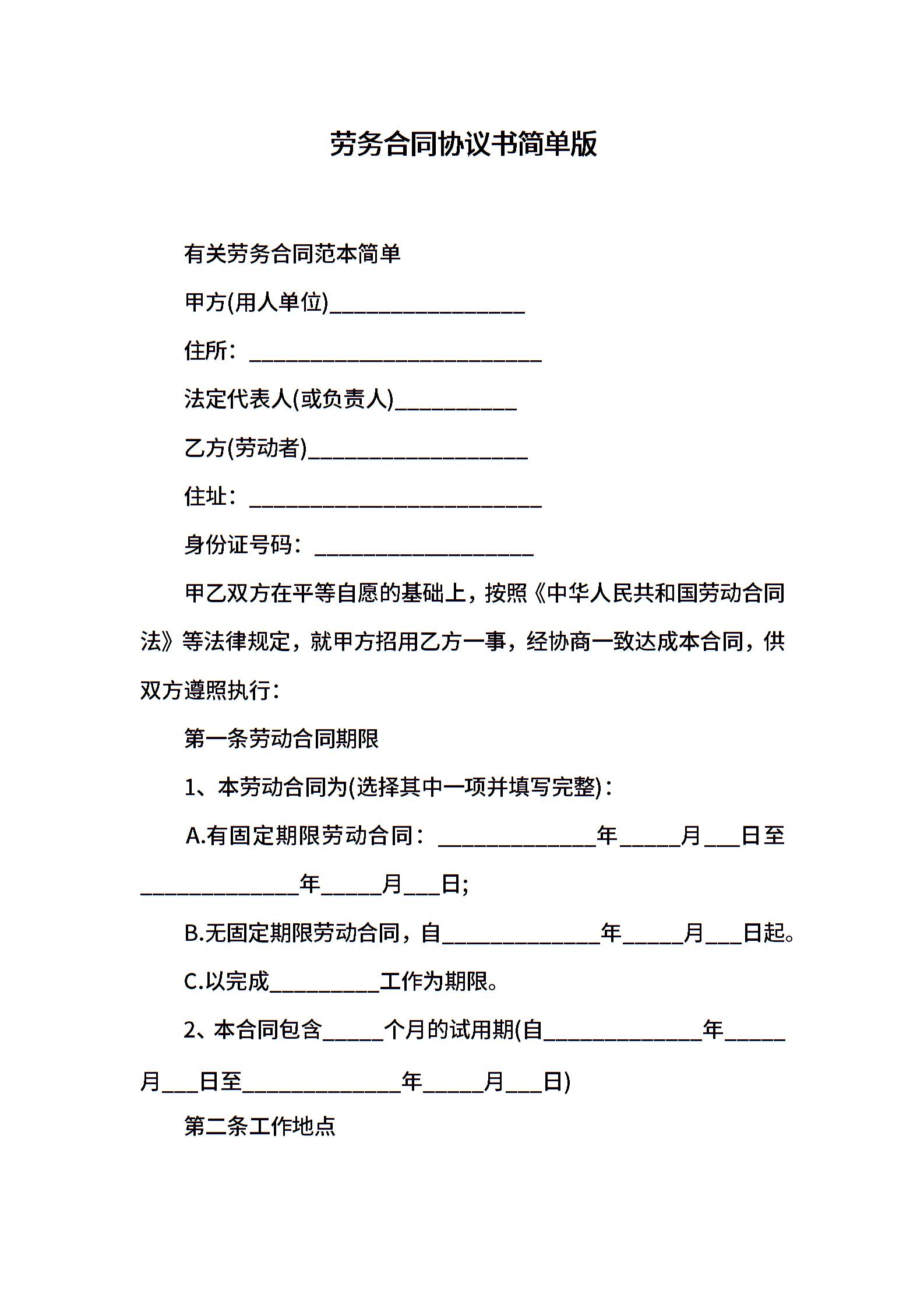 劳务合同协议书简单版