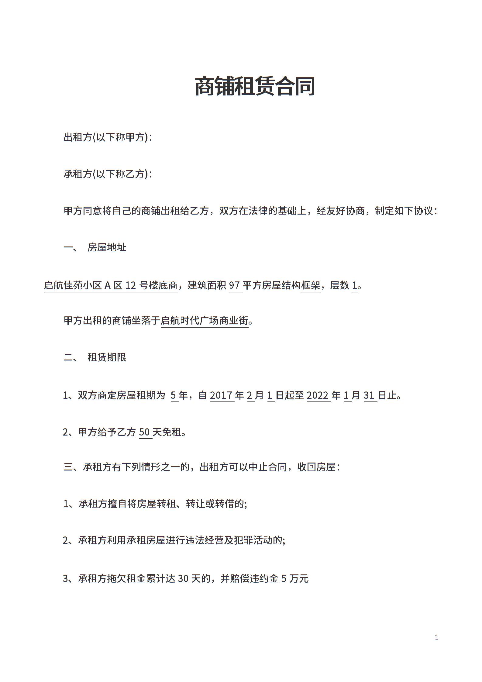 商铺租房合同范本一模板
