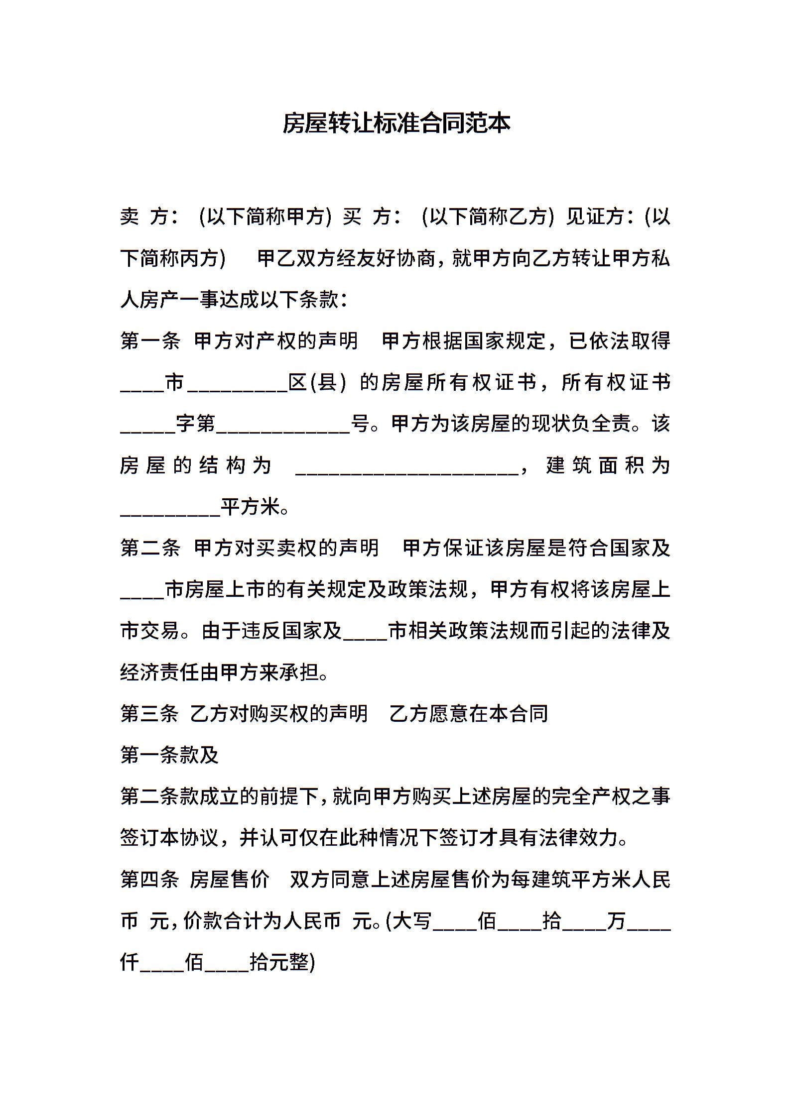 房屋转让标准合同范本