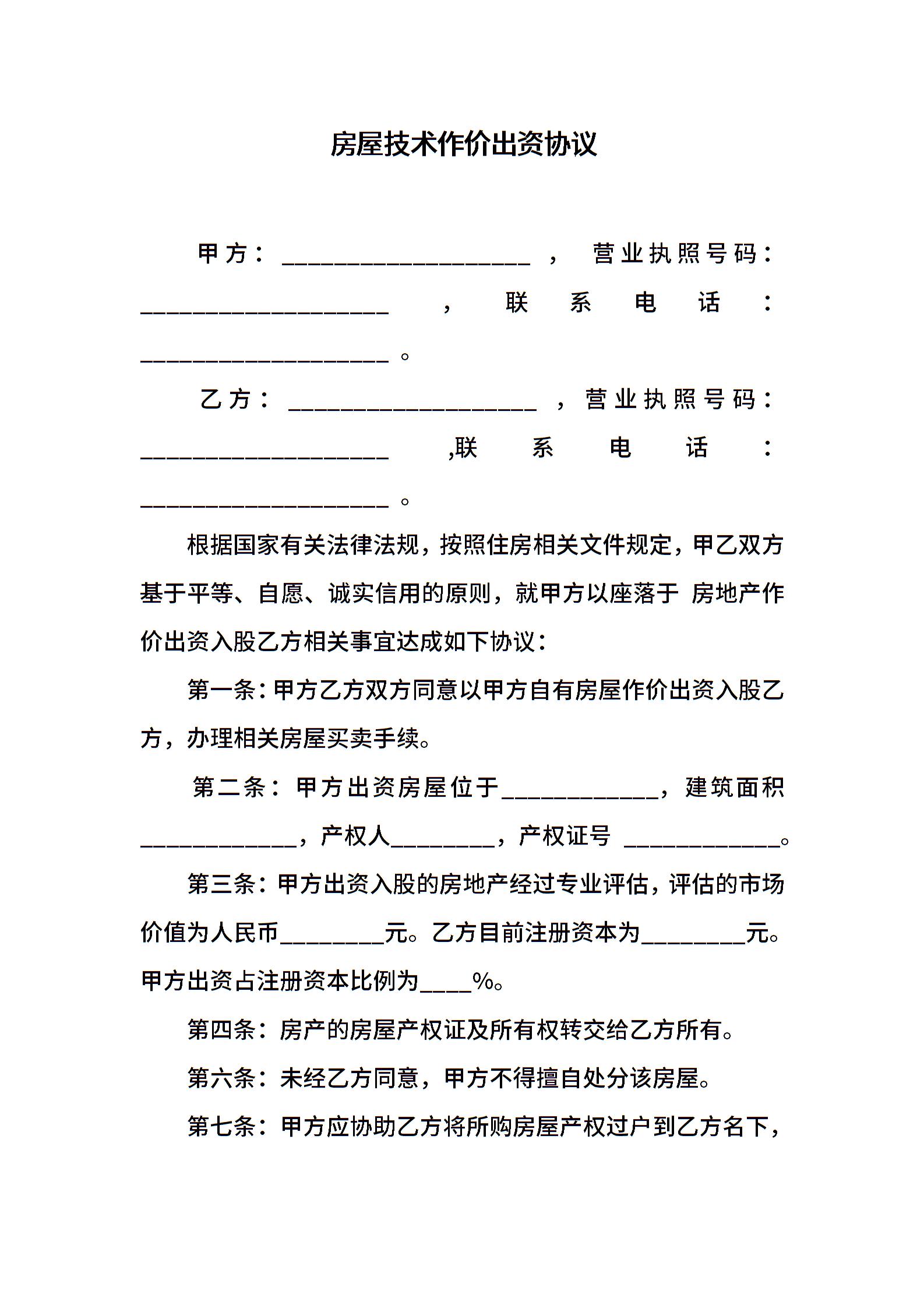 房屋技术作价出资协议