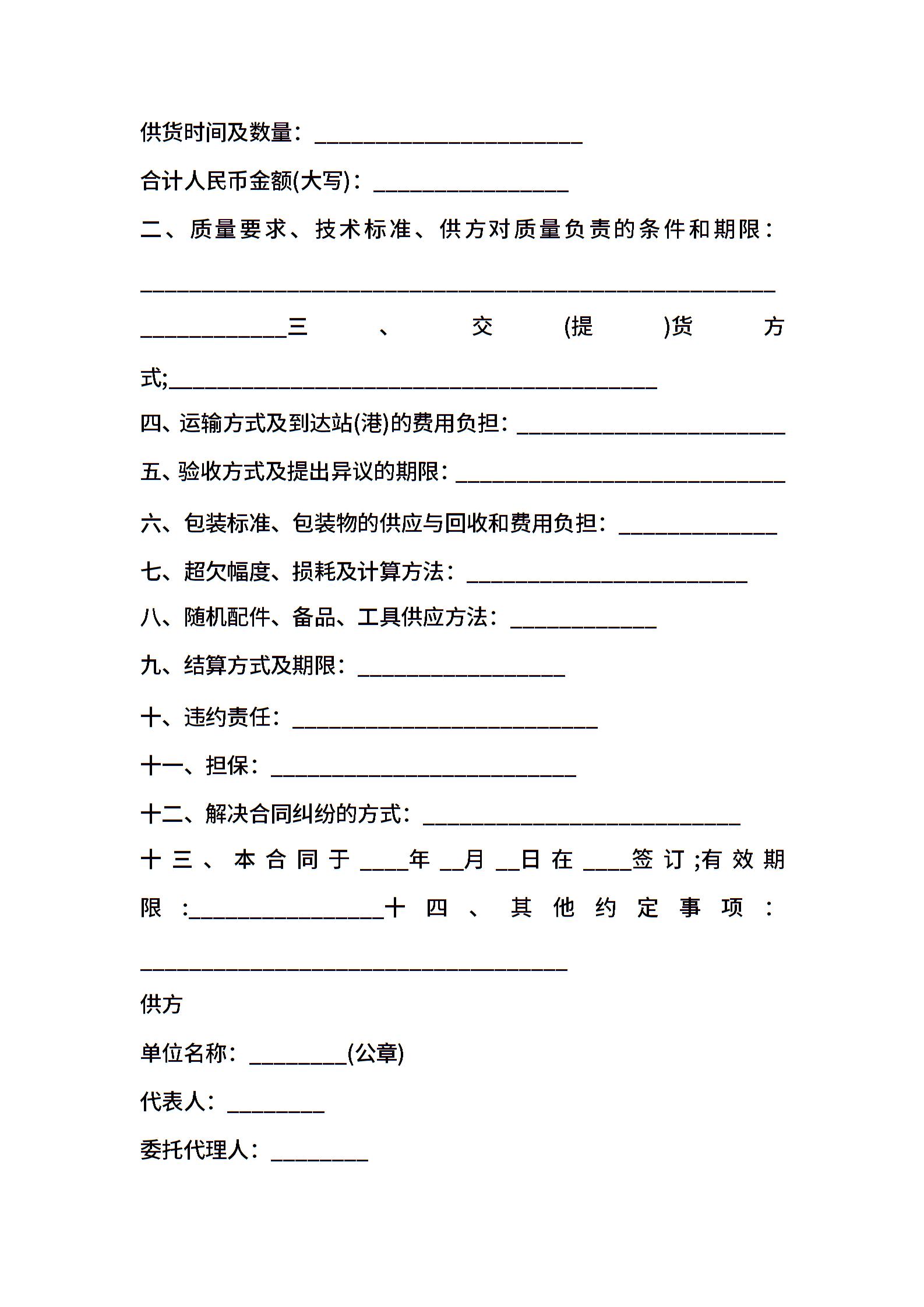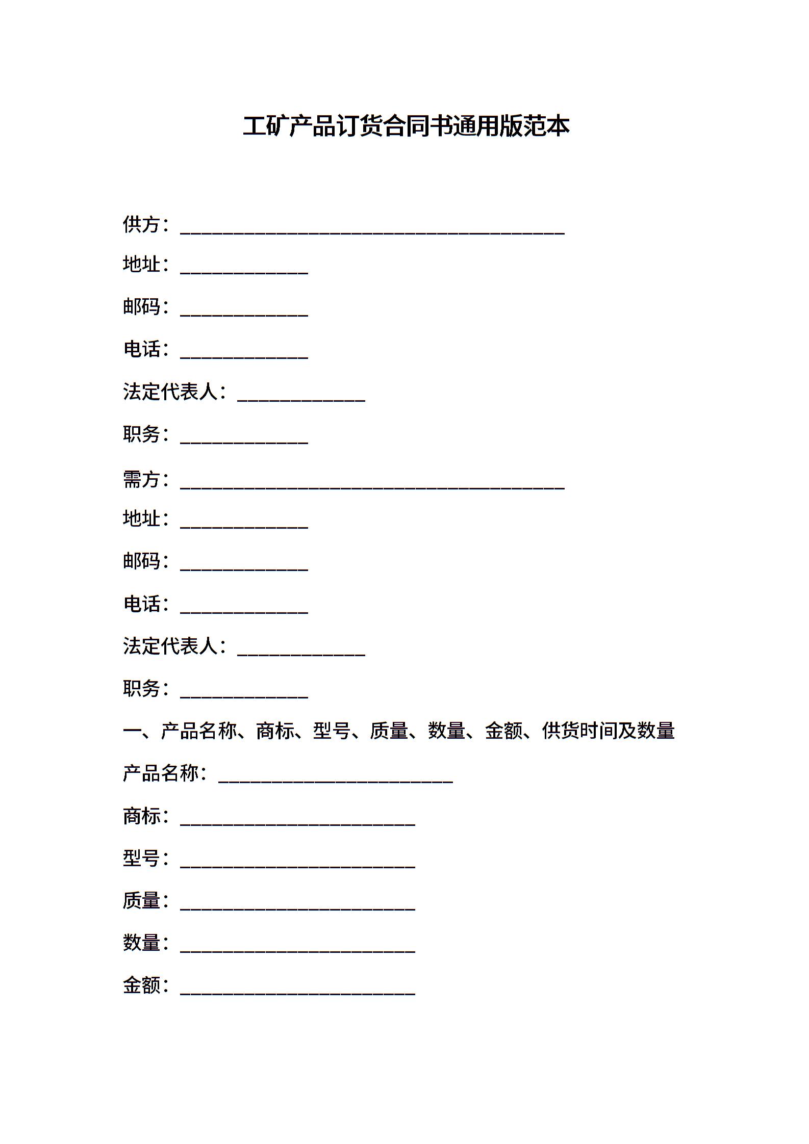 工矿产品订货合同书通用版范本
