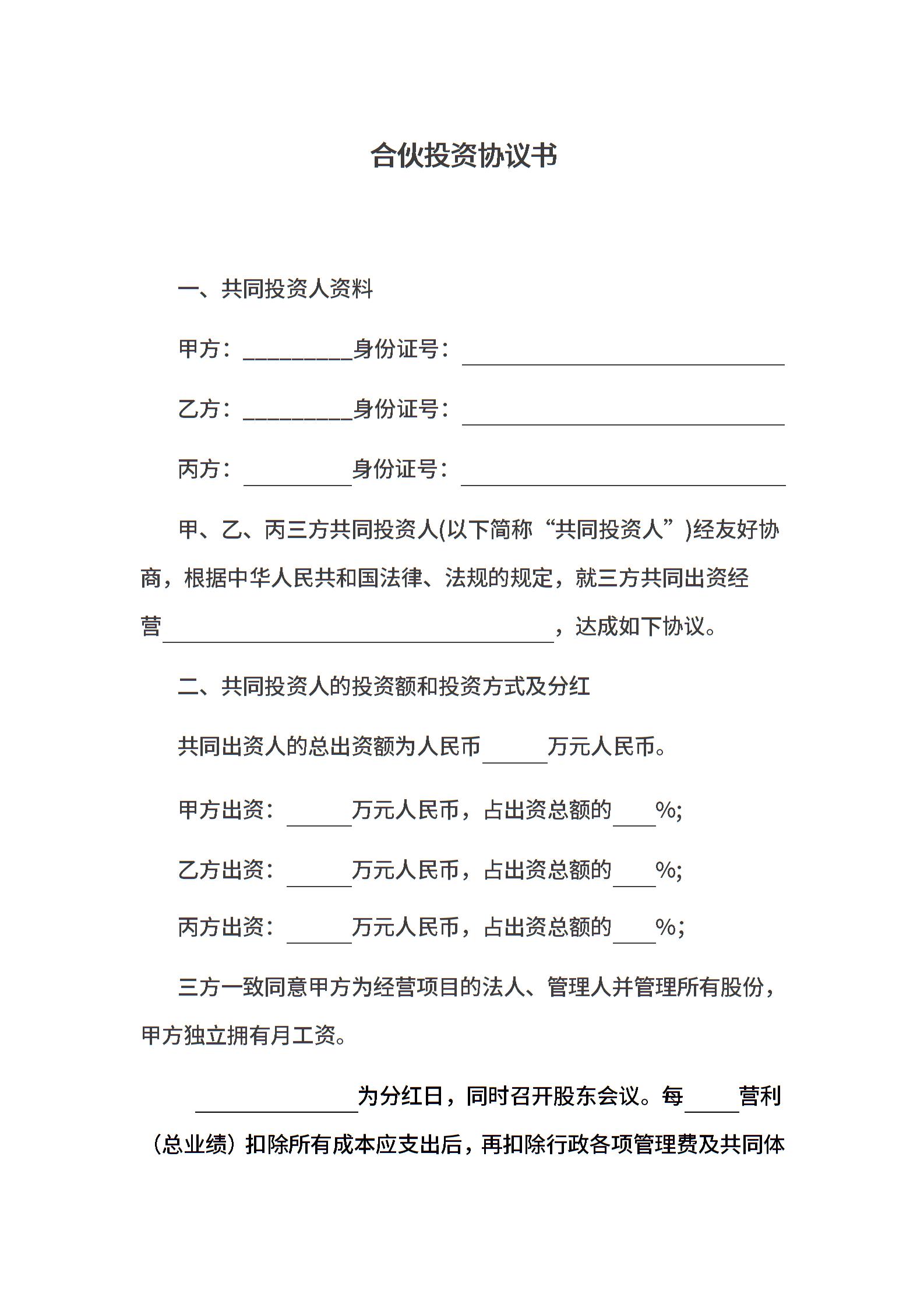 合伙投资协议书(经典范本)