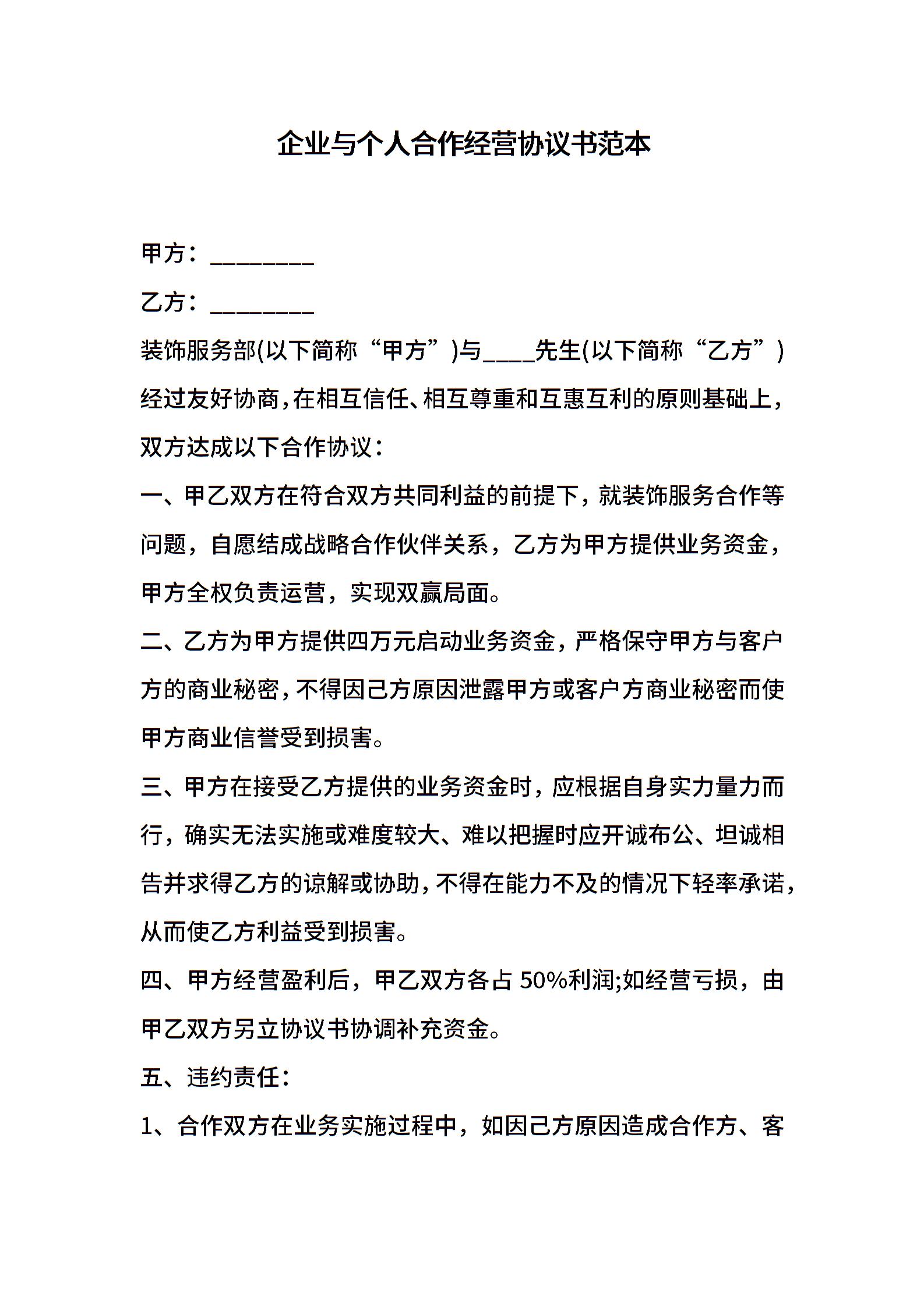 企业与个人合作经营协议书范本
