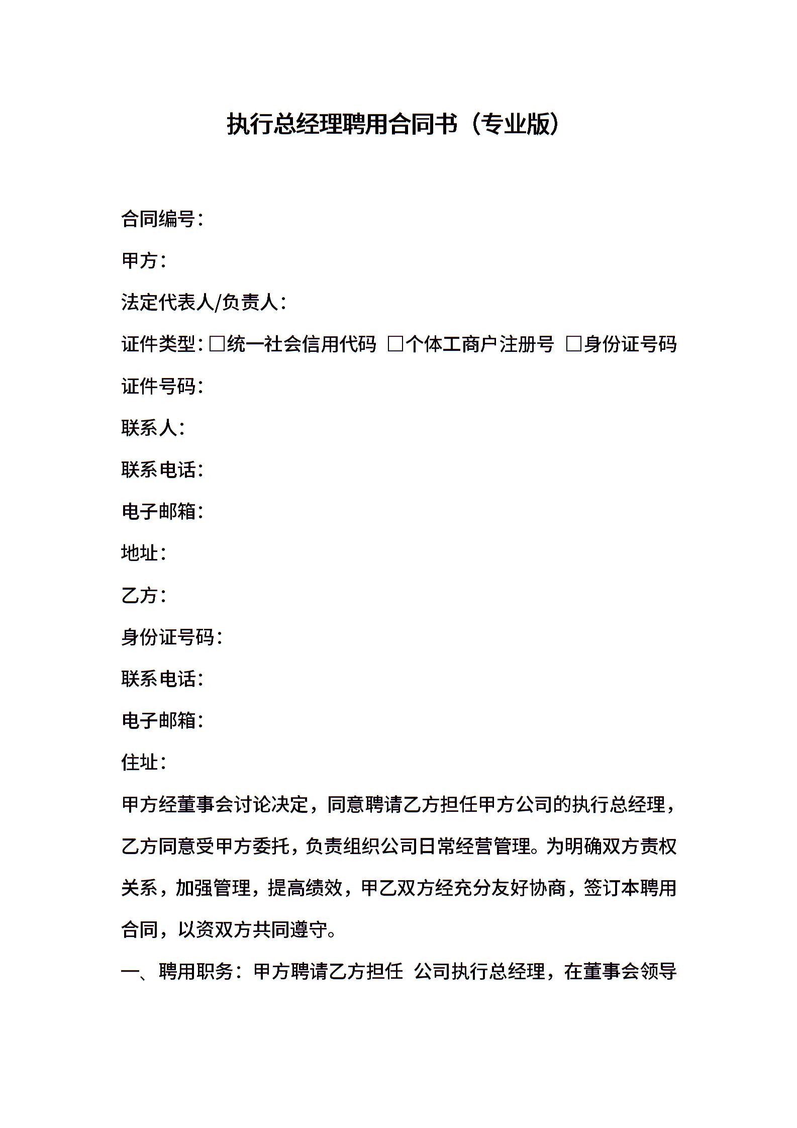 执行总经理聘用合同书(专业版)