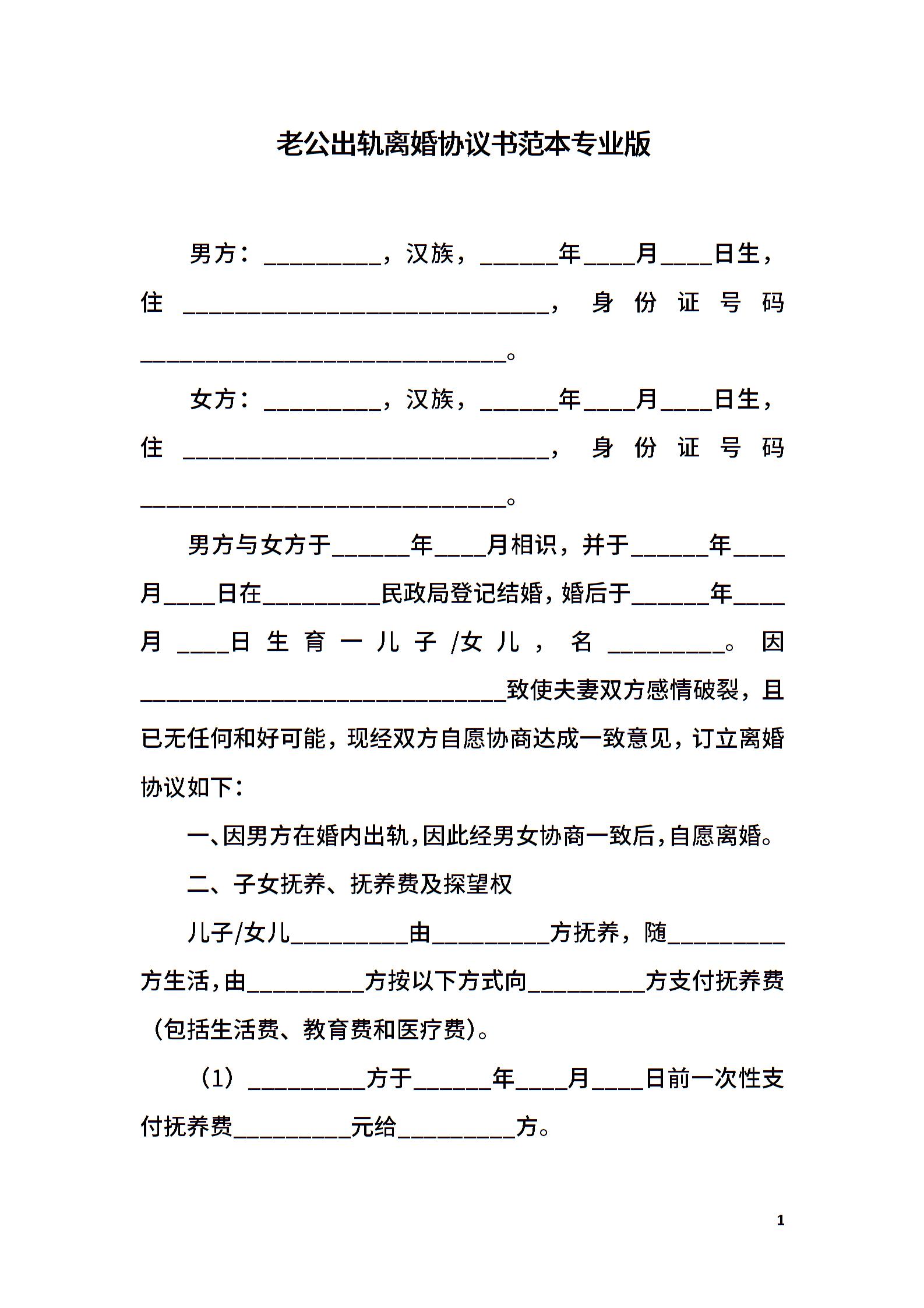 老公出轨离婚协议书范本专业版
