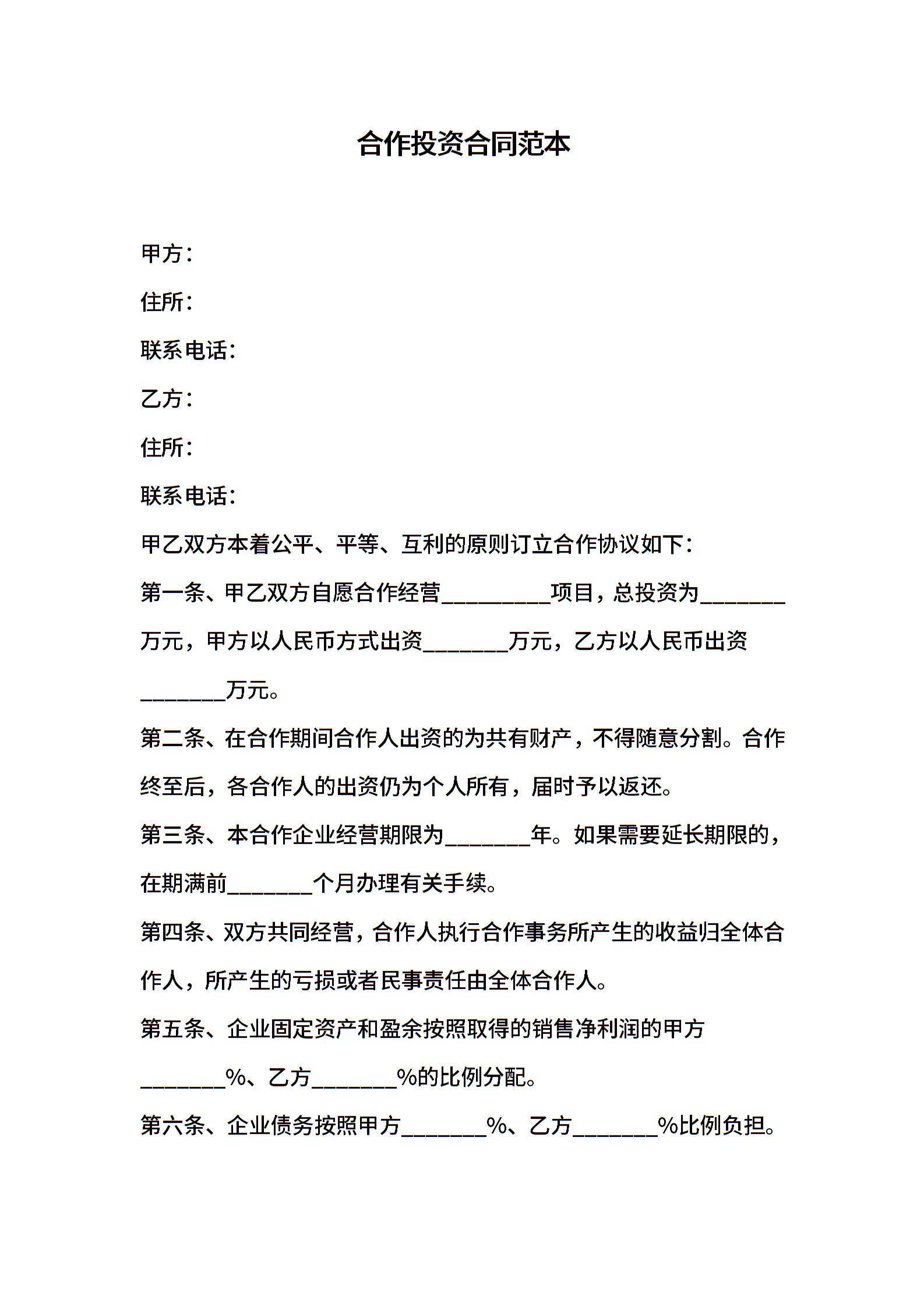 合作投资合同范本 (2)