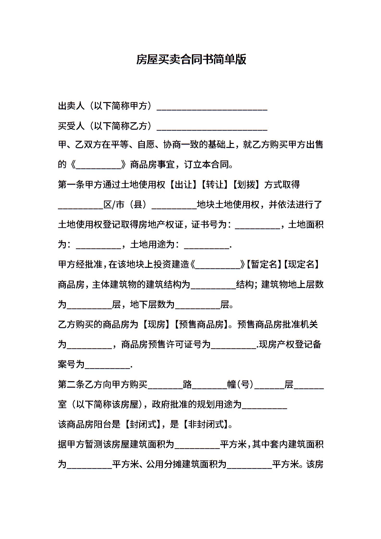 房屋买卖合同书简单版