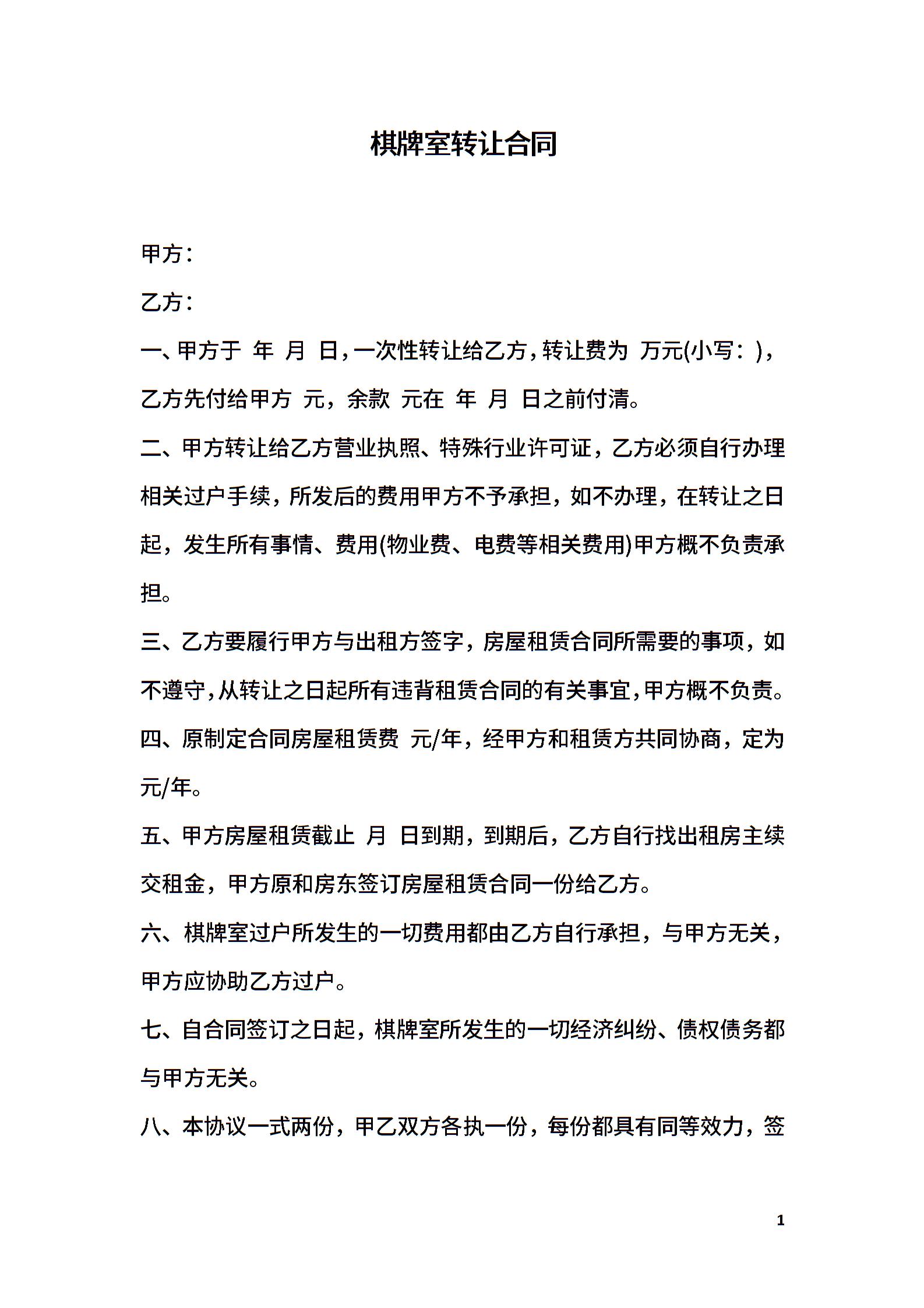 棋牌室转让合同