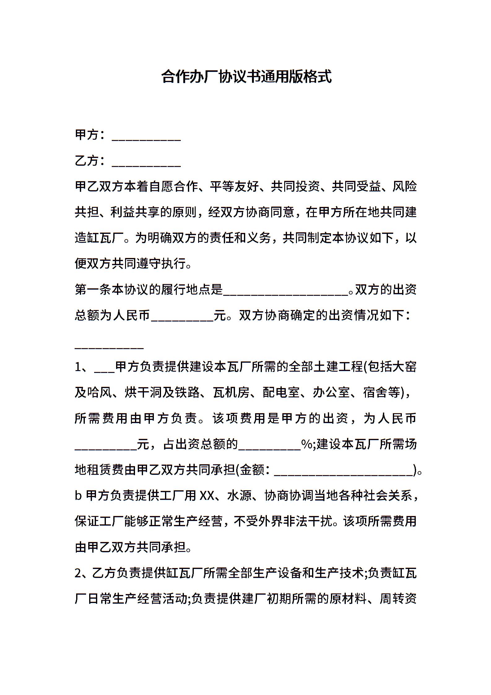 合作办厂协议书通用版格式