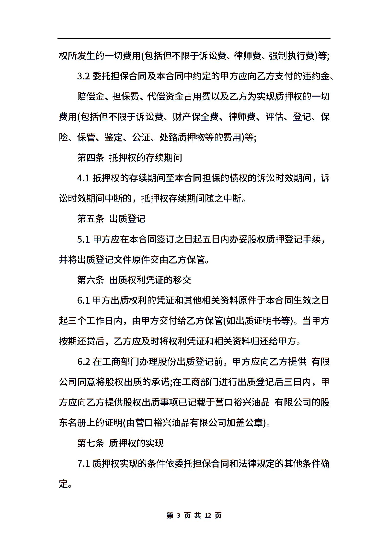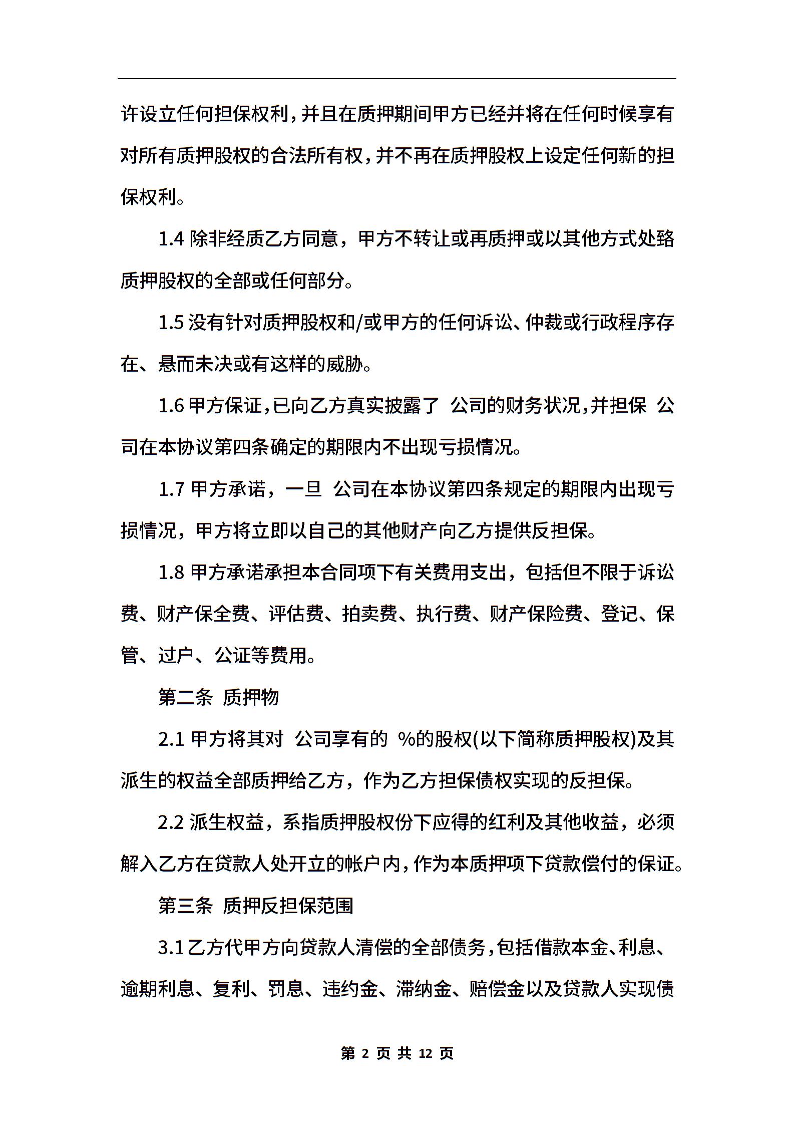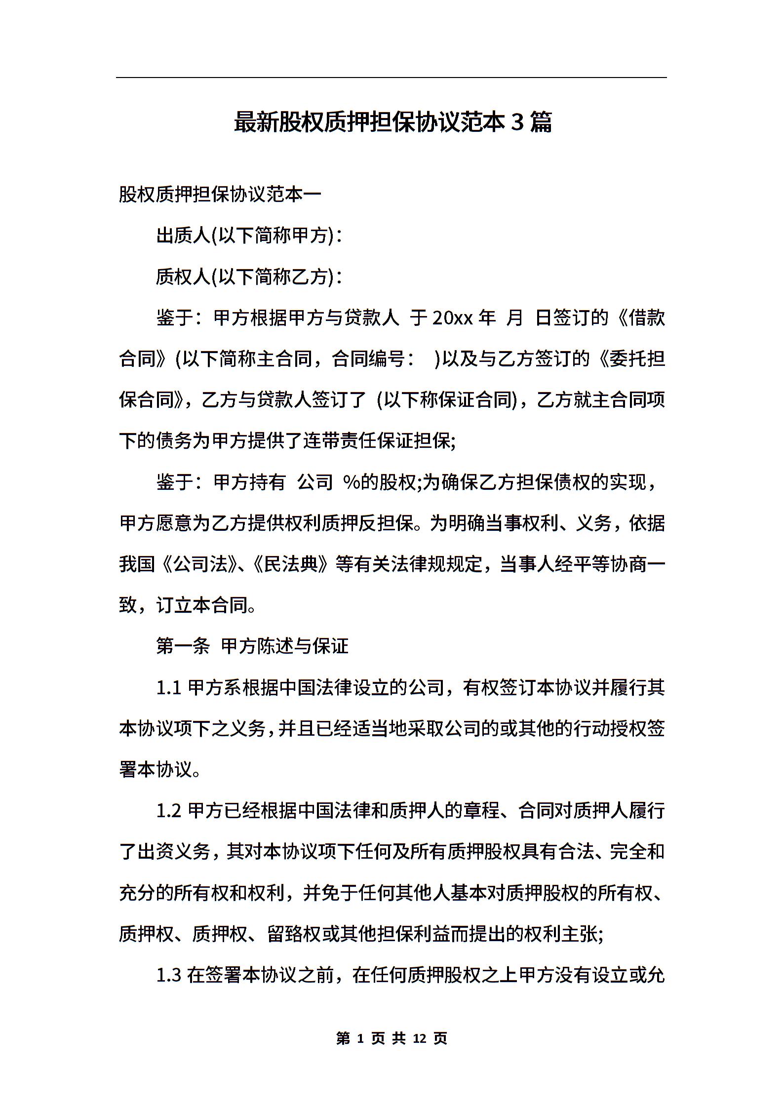 最新股权质押担保协议范本3篇