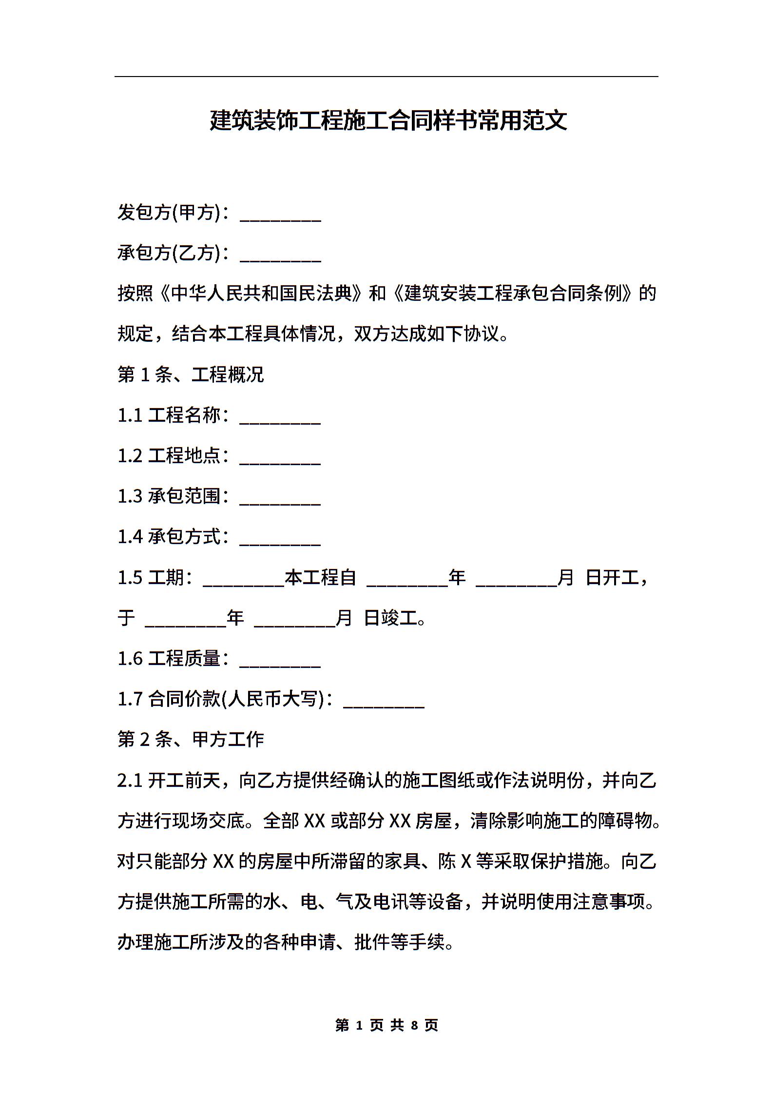 建筑装饰工程施工合同样书常用范文