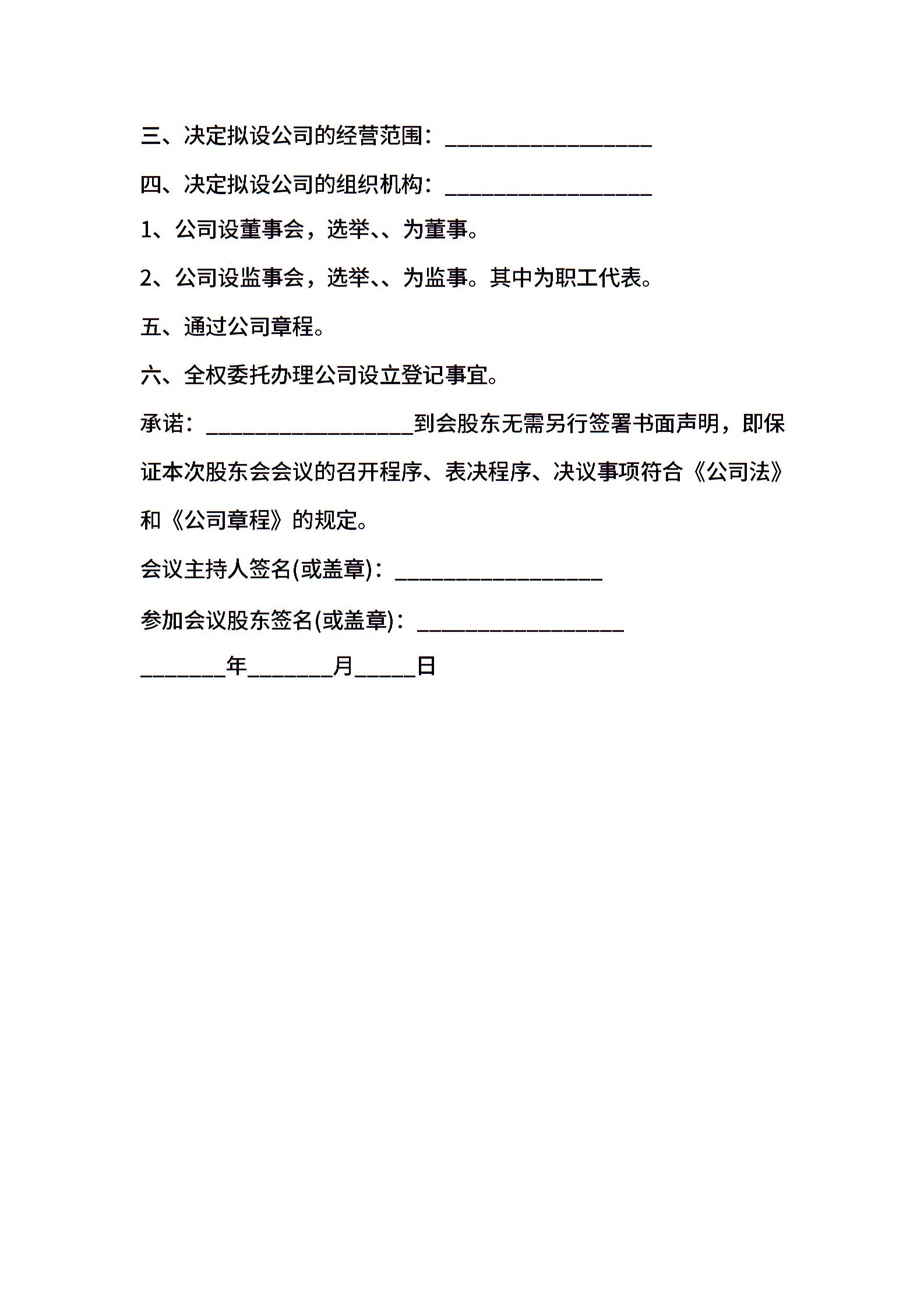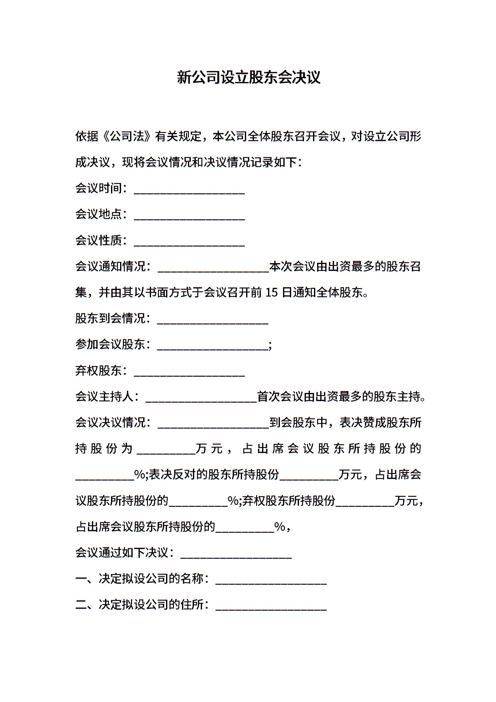 新公司设立股东会决议