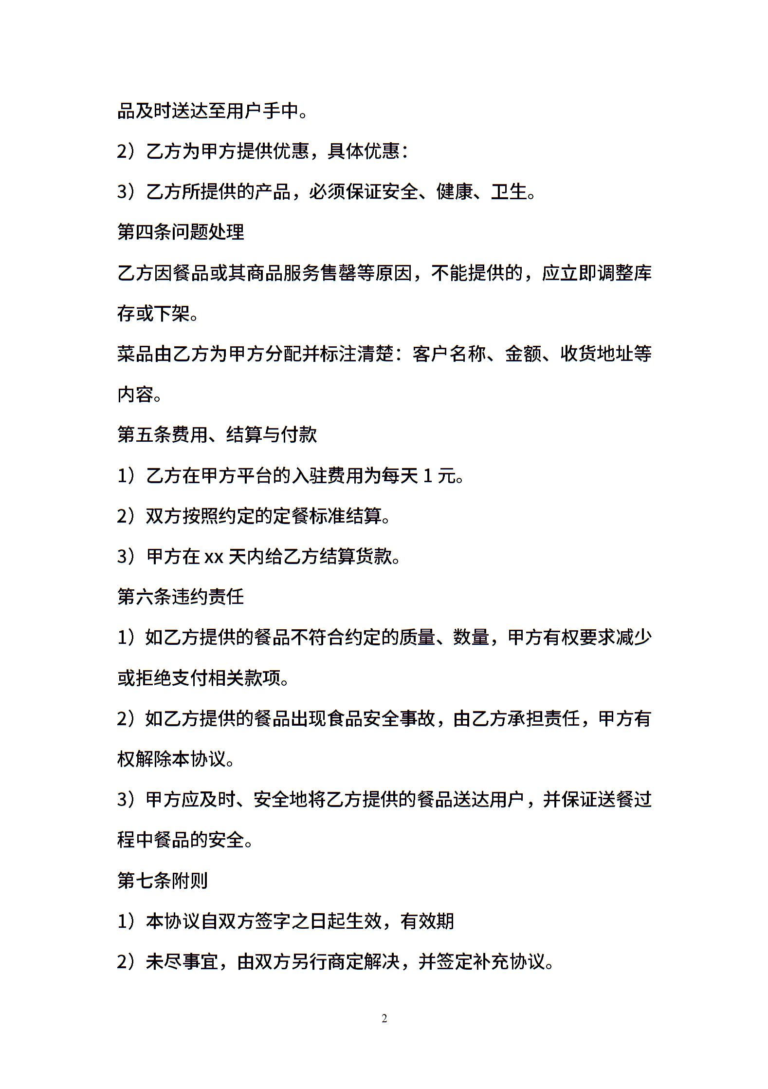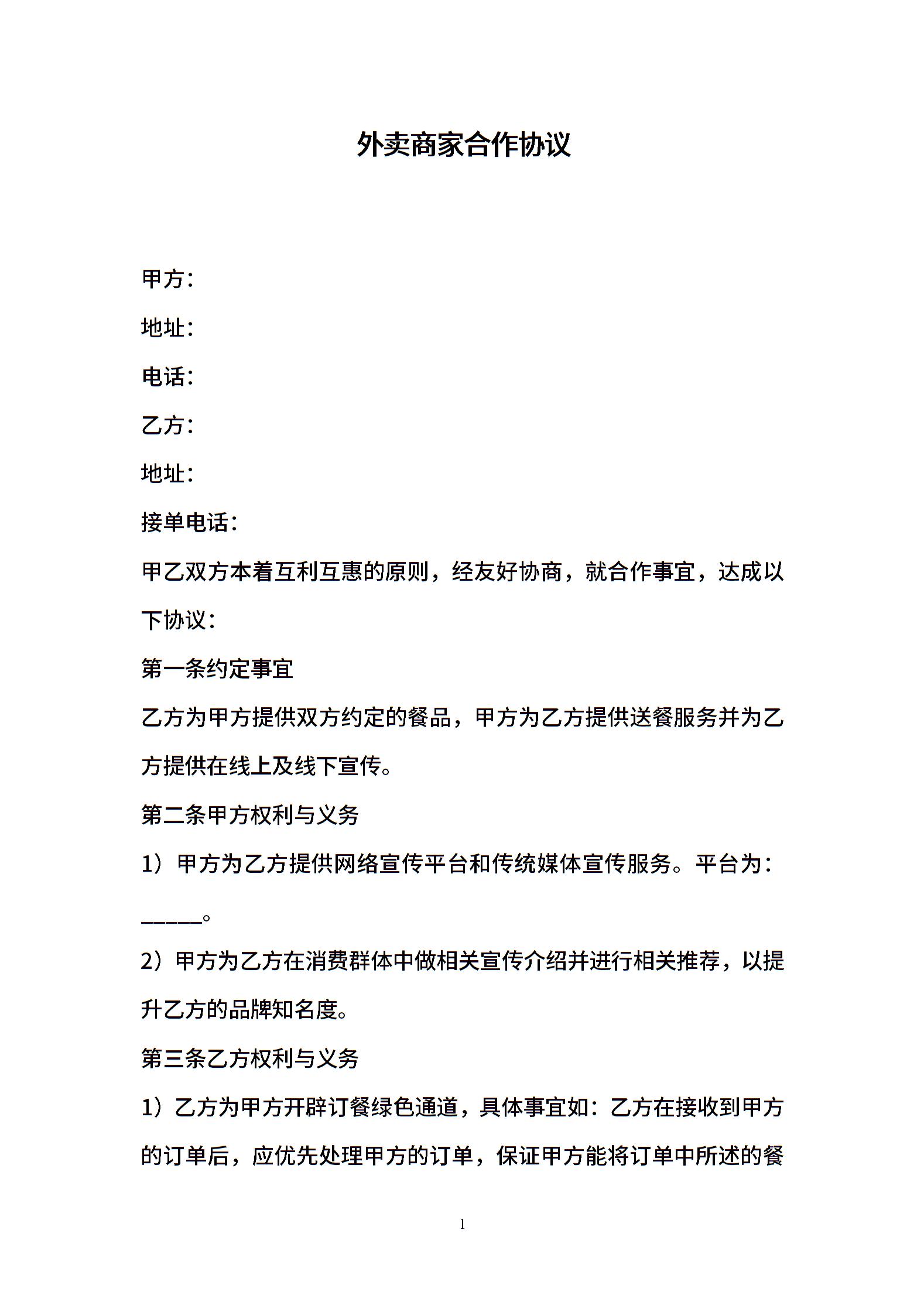 外卖商家合作协议