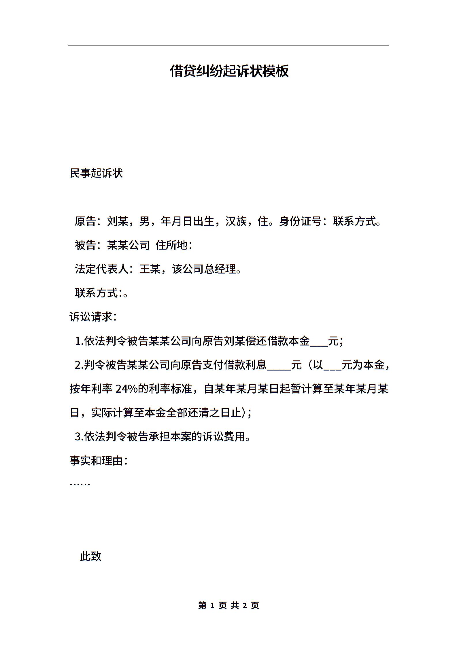 借贷纠纷起诉状模板