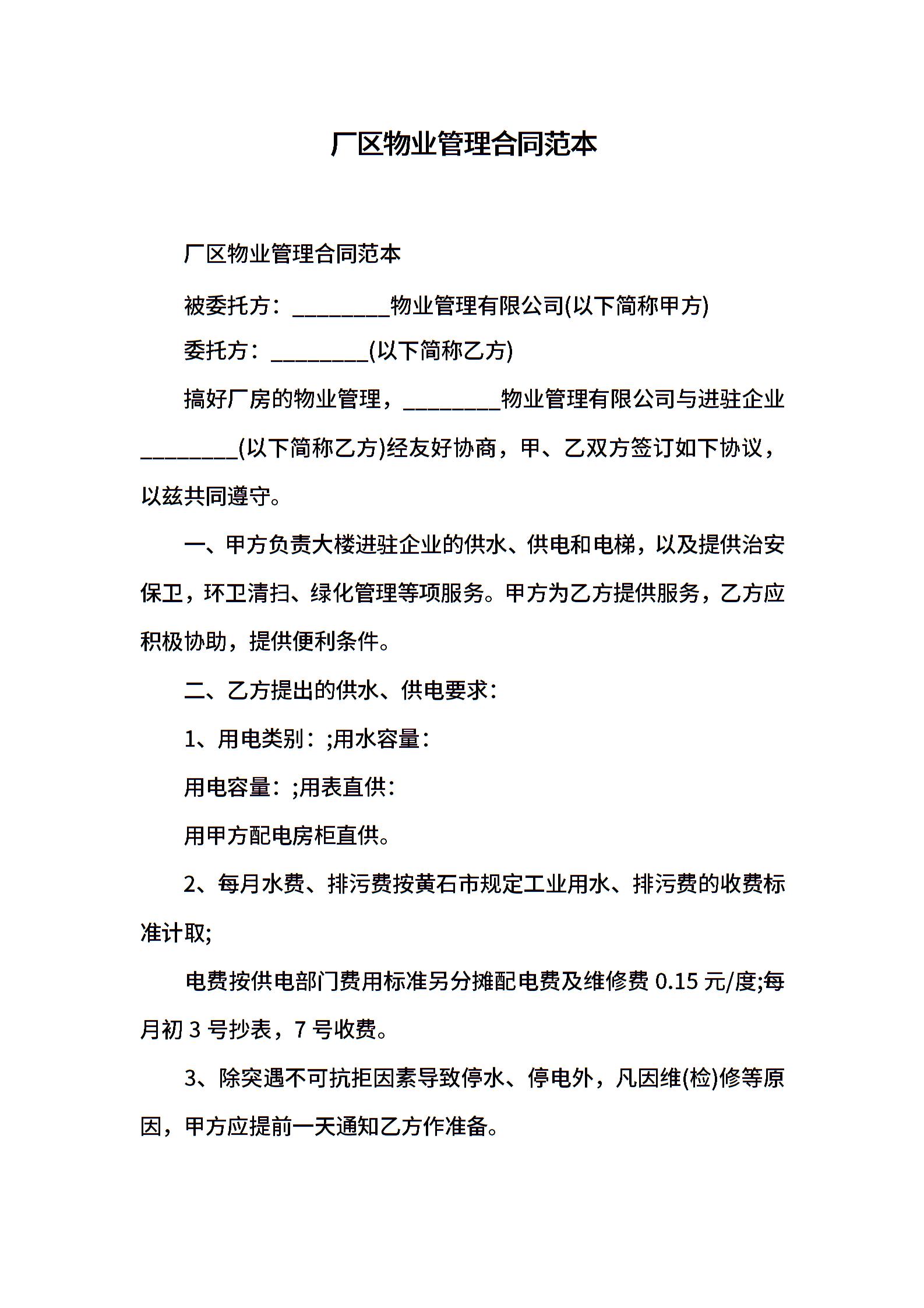 厂区物业管理合同范本