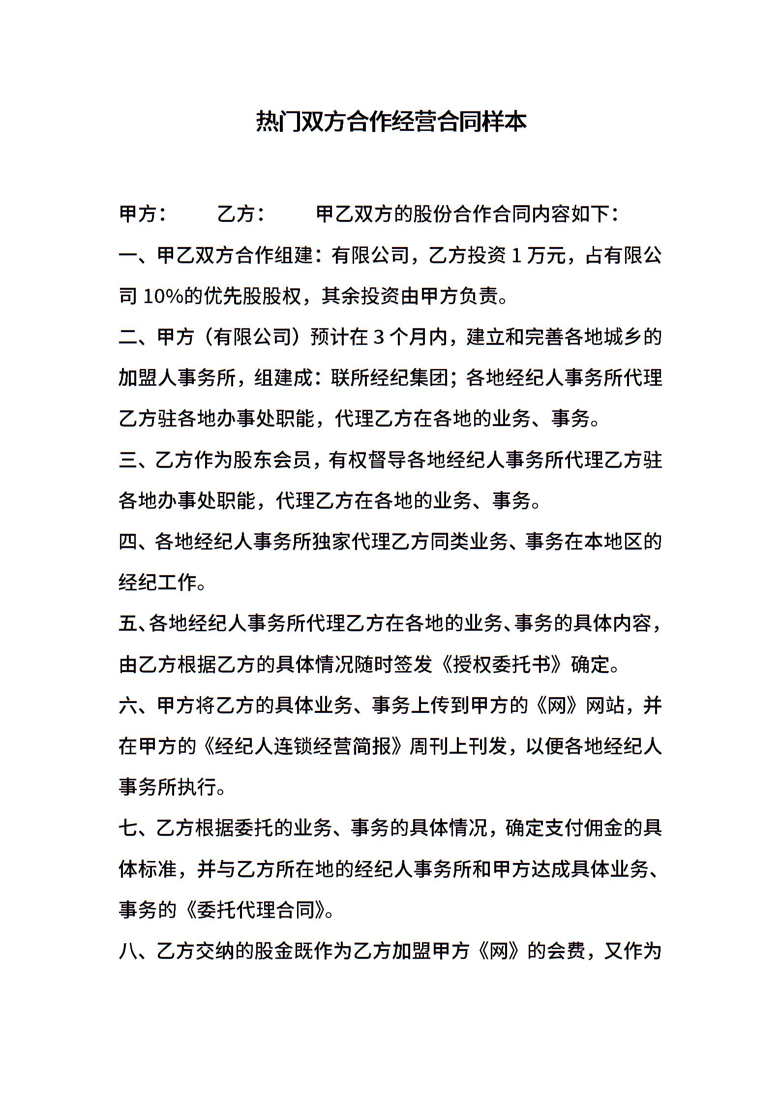 热门双方合作经营合同样本