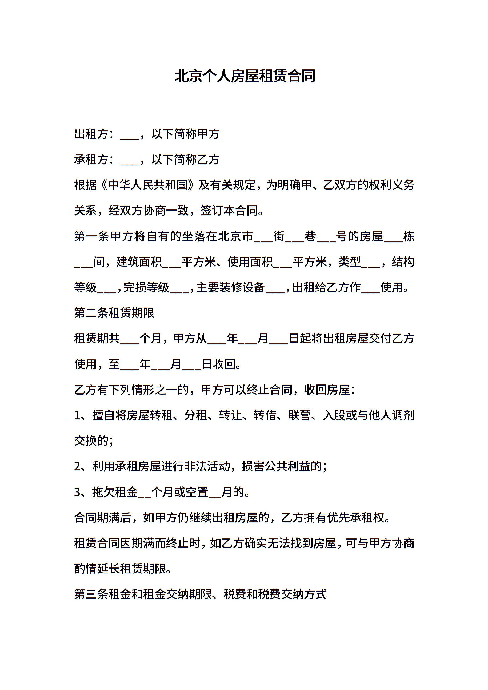 2021年北京个人房屋租赁合同