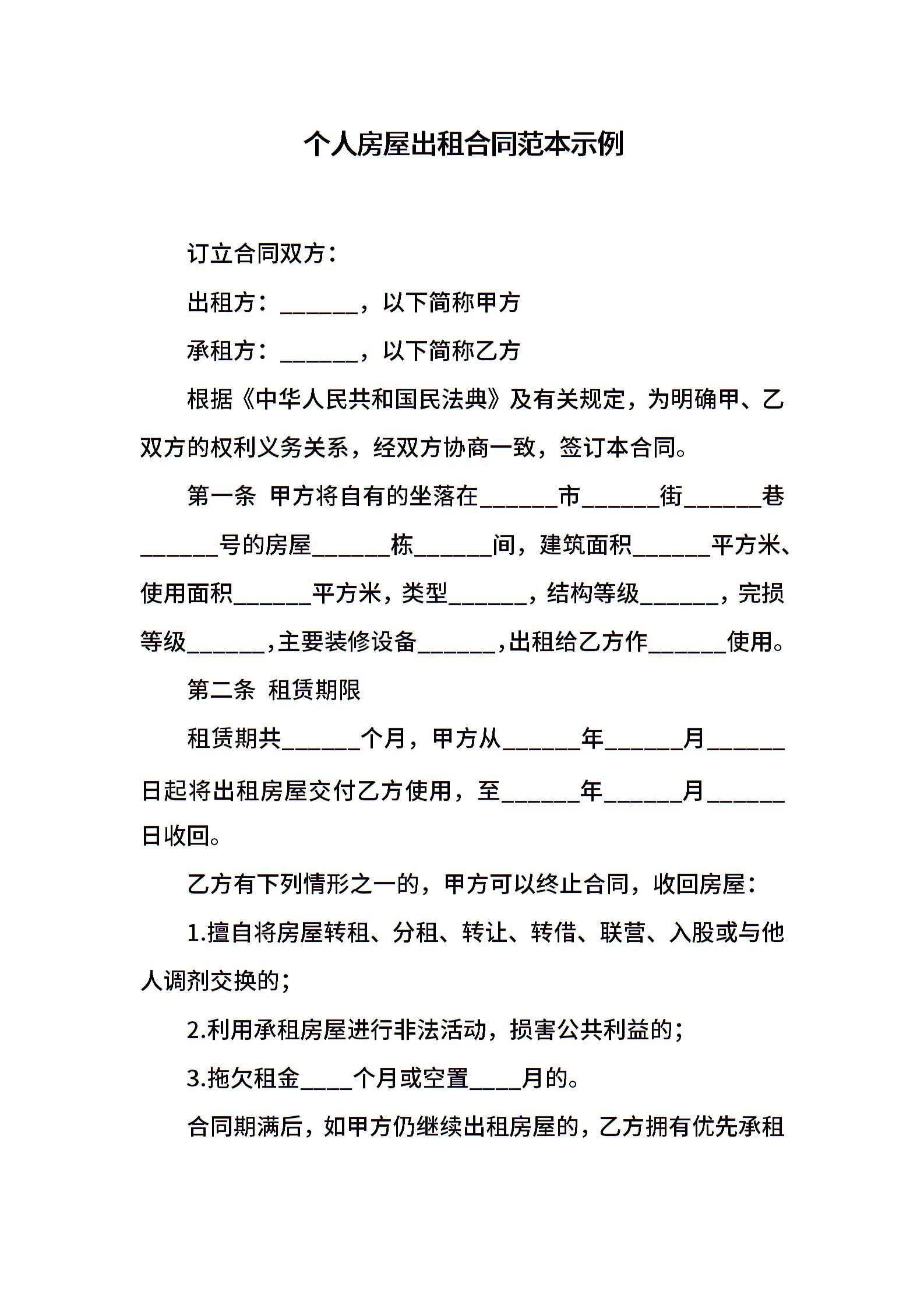 个人房屋出租合同范本示例
