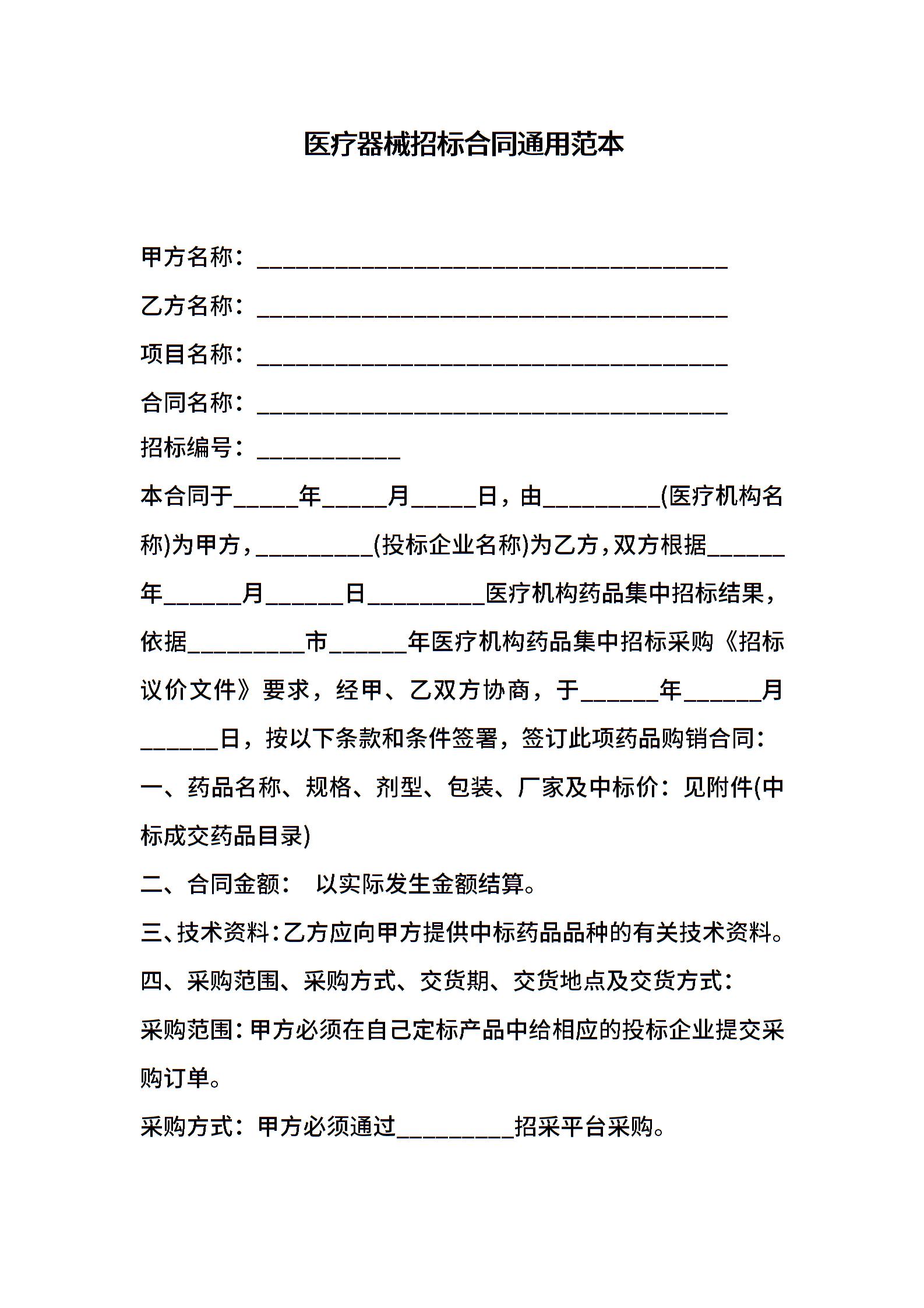 医疗器械招标合同通用范本