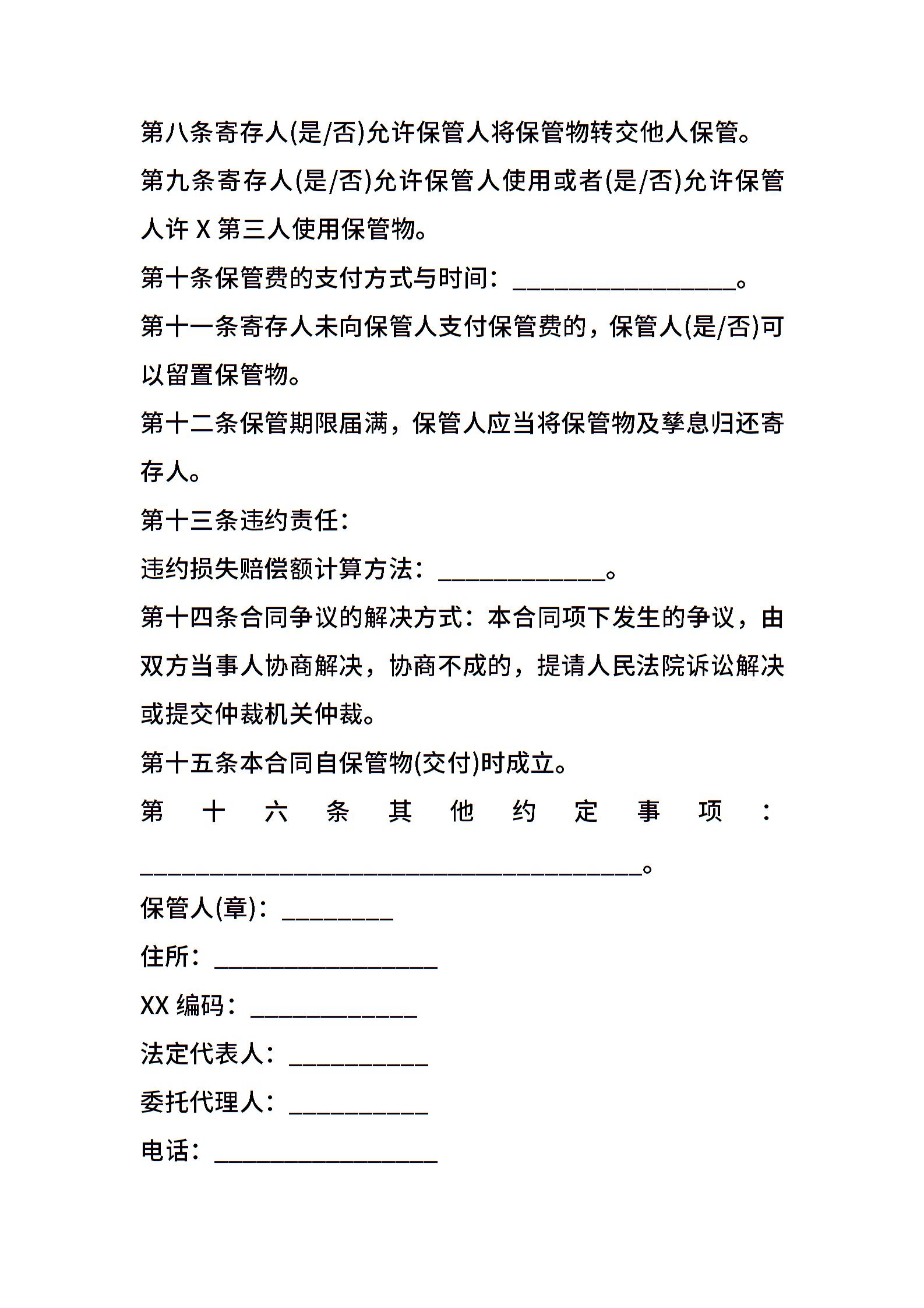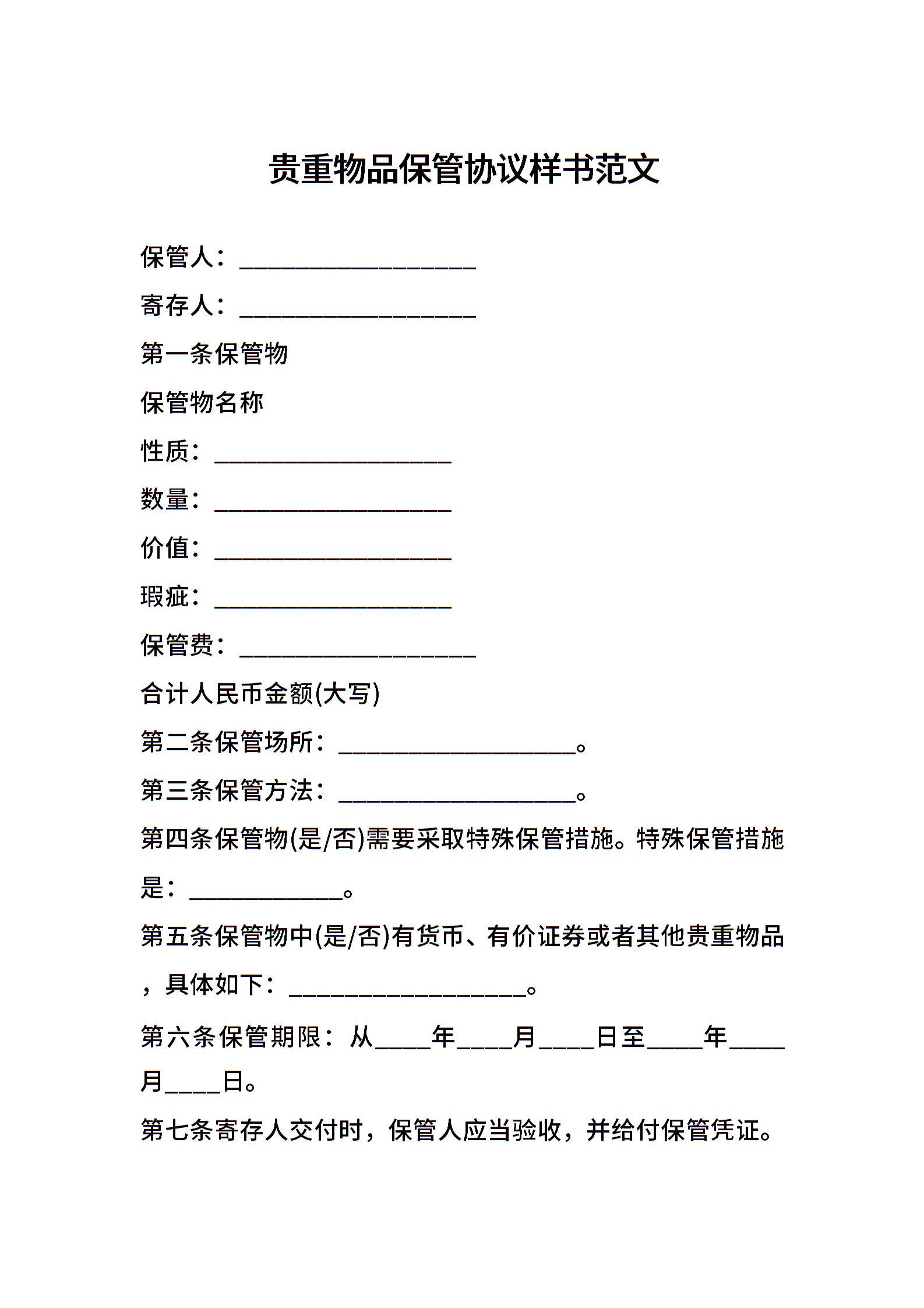 贵重物品保管协议样书范文