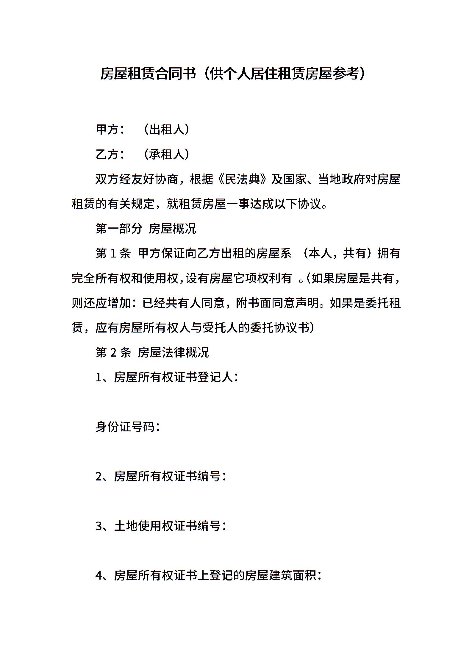 房屋租赁合同书(供个人居住租赁房屋参考)
