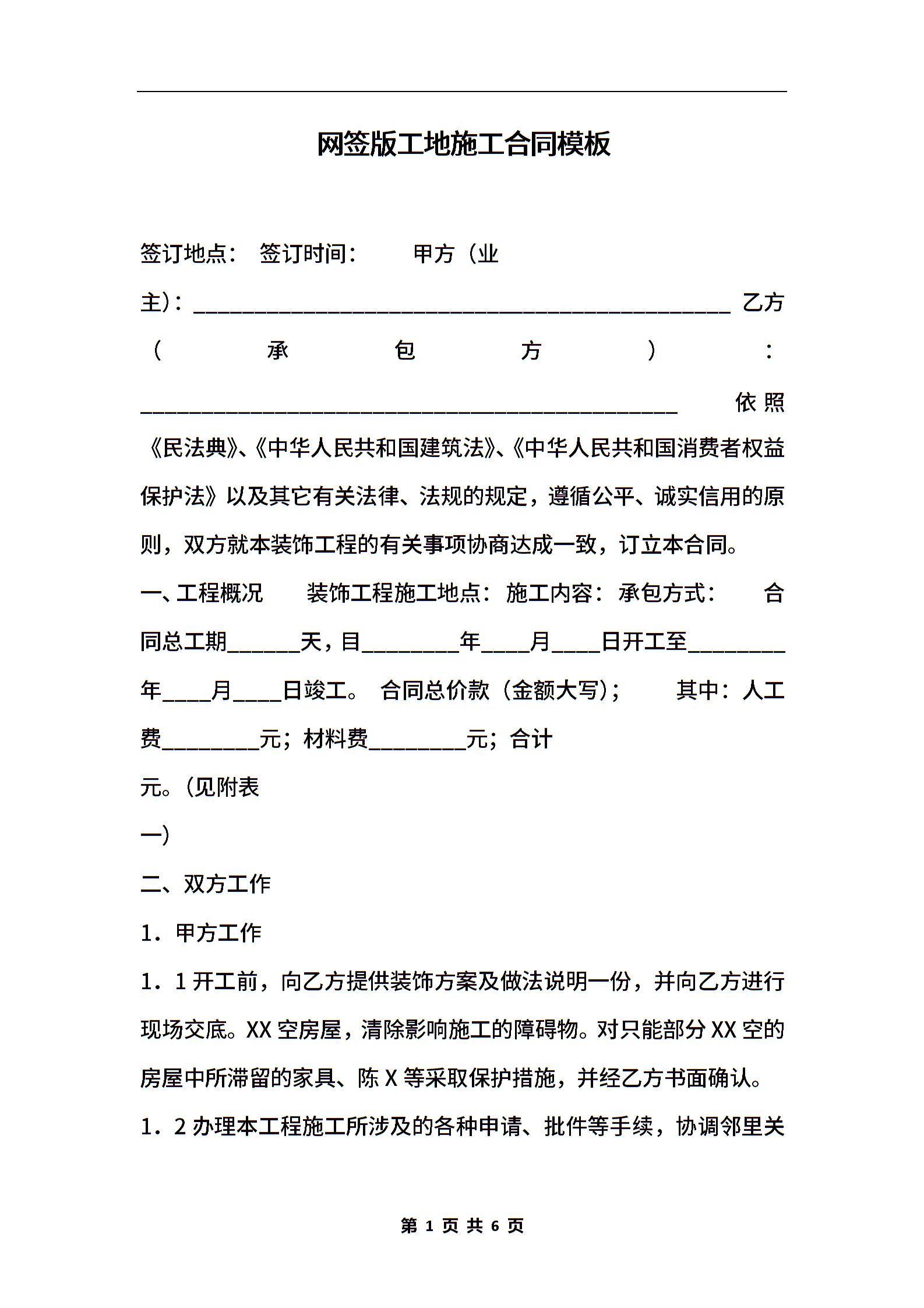 网签版工地施工合同模板