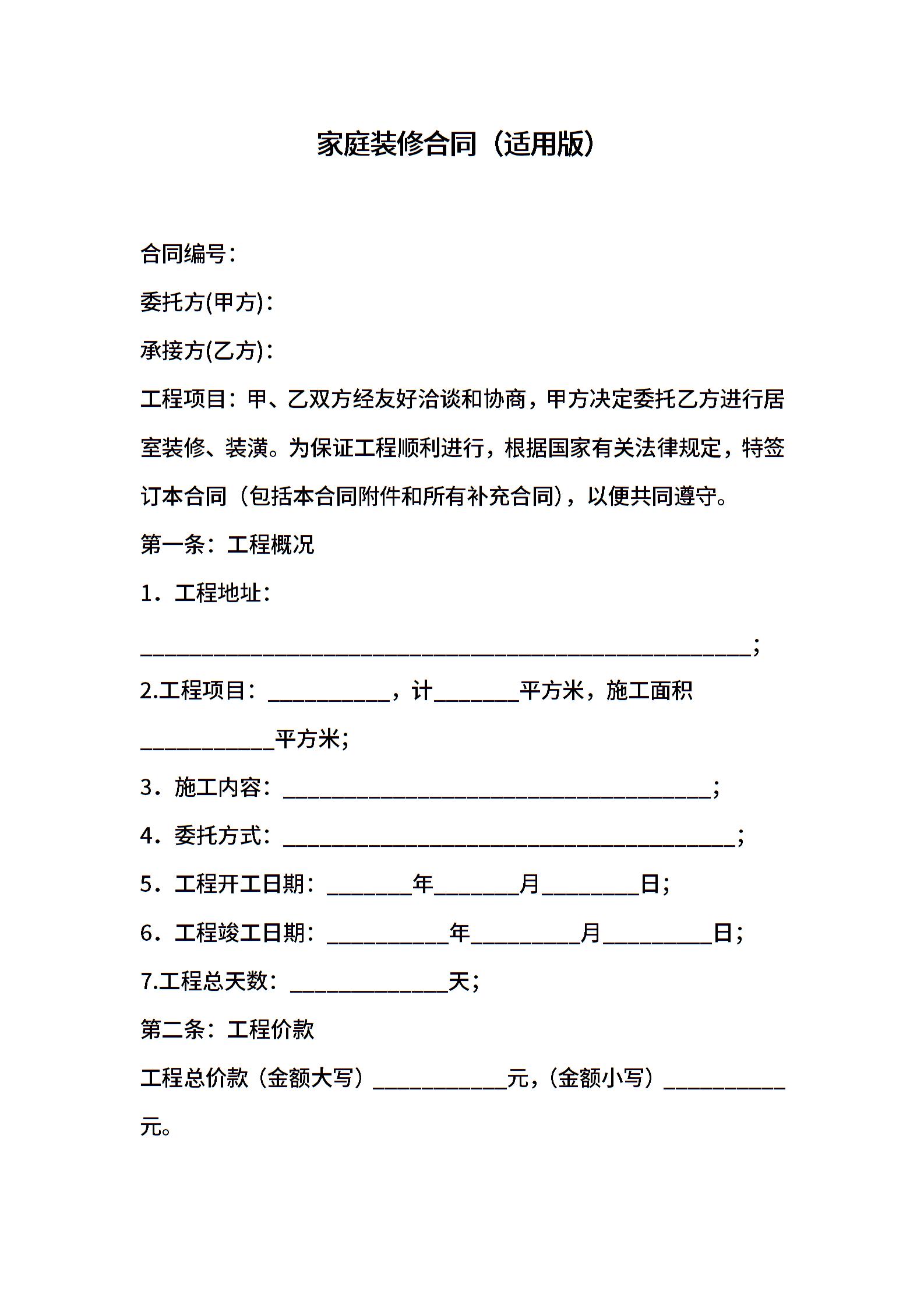 家庭装修合同(适用版)