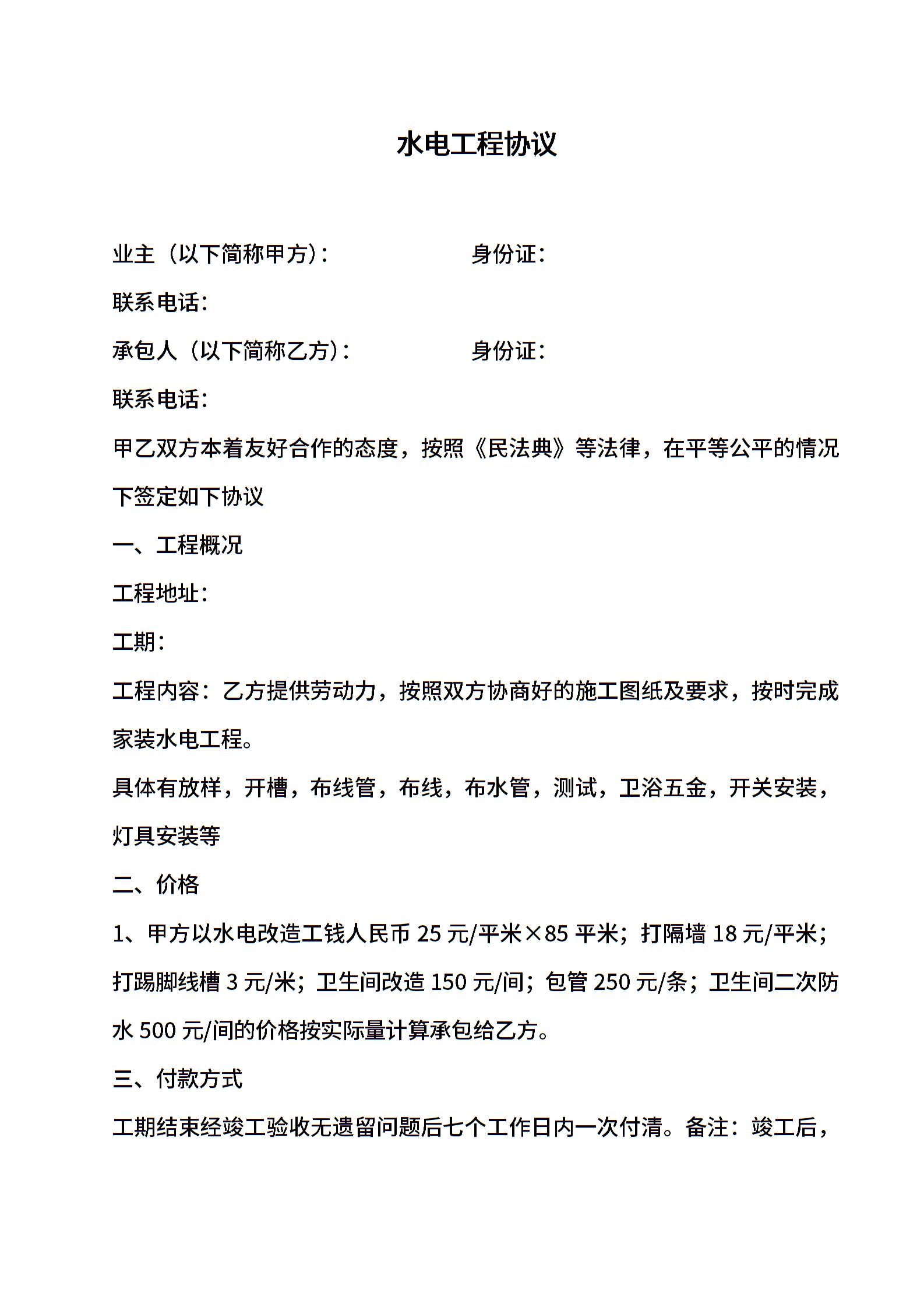 家装水电工合同