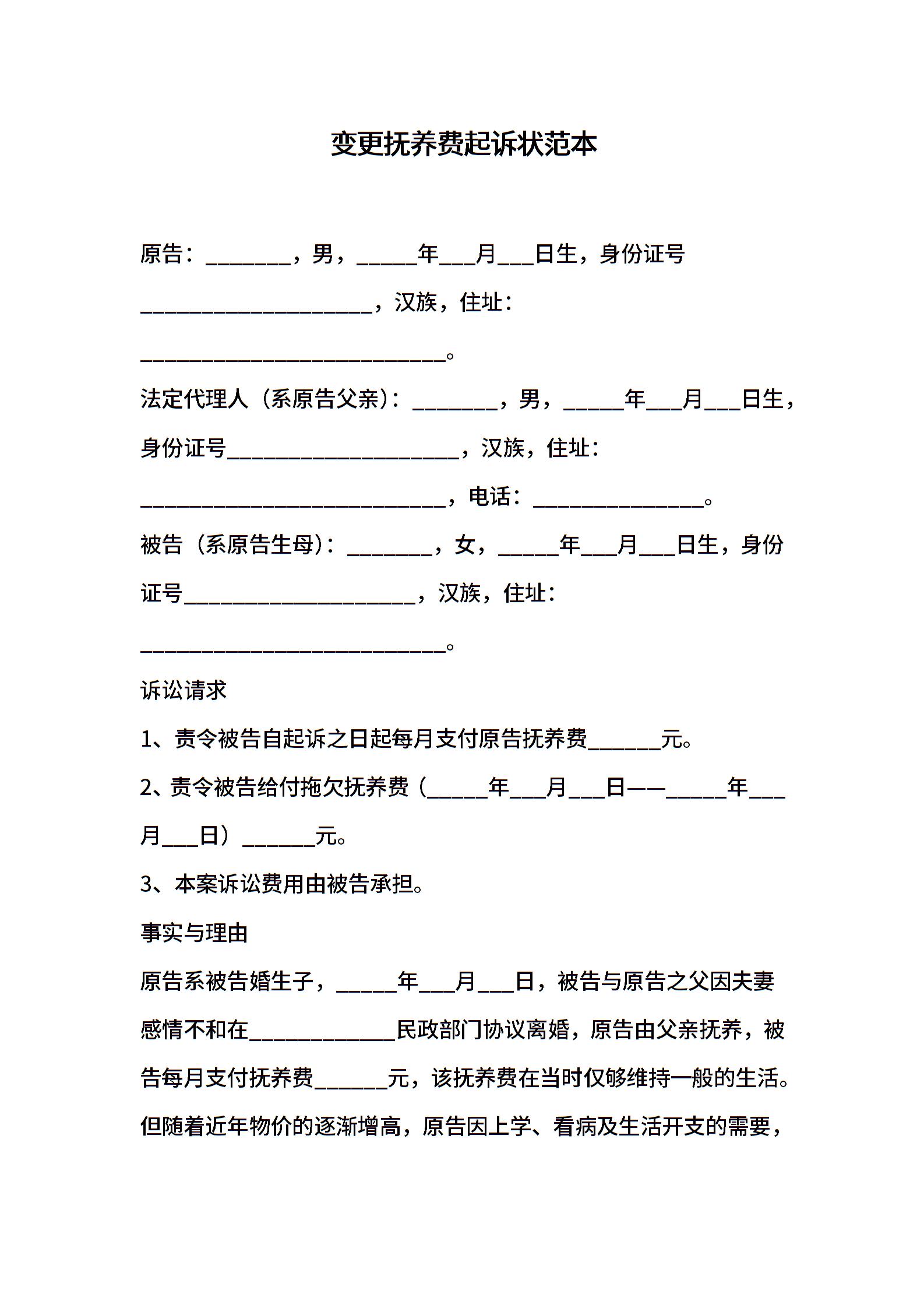 变更抚养费起诉状范本