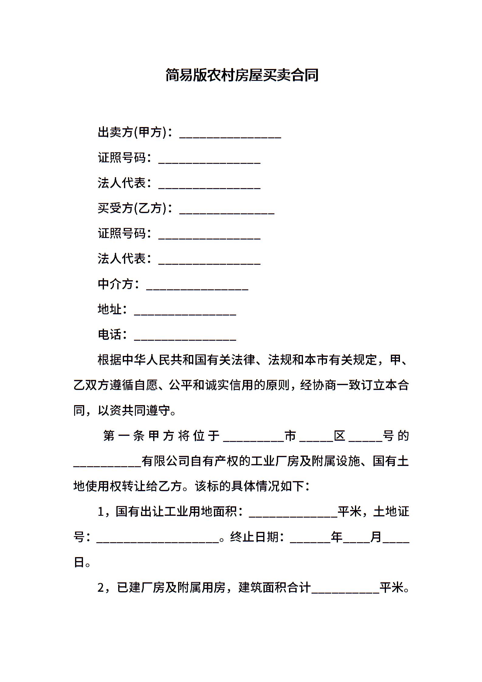 简易版农村房屋买卖合同