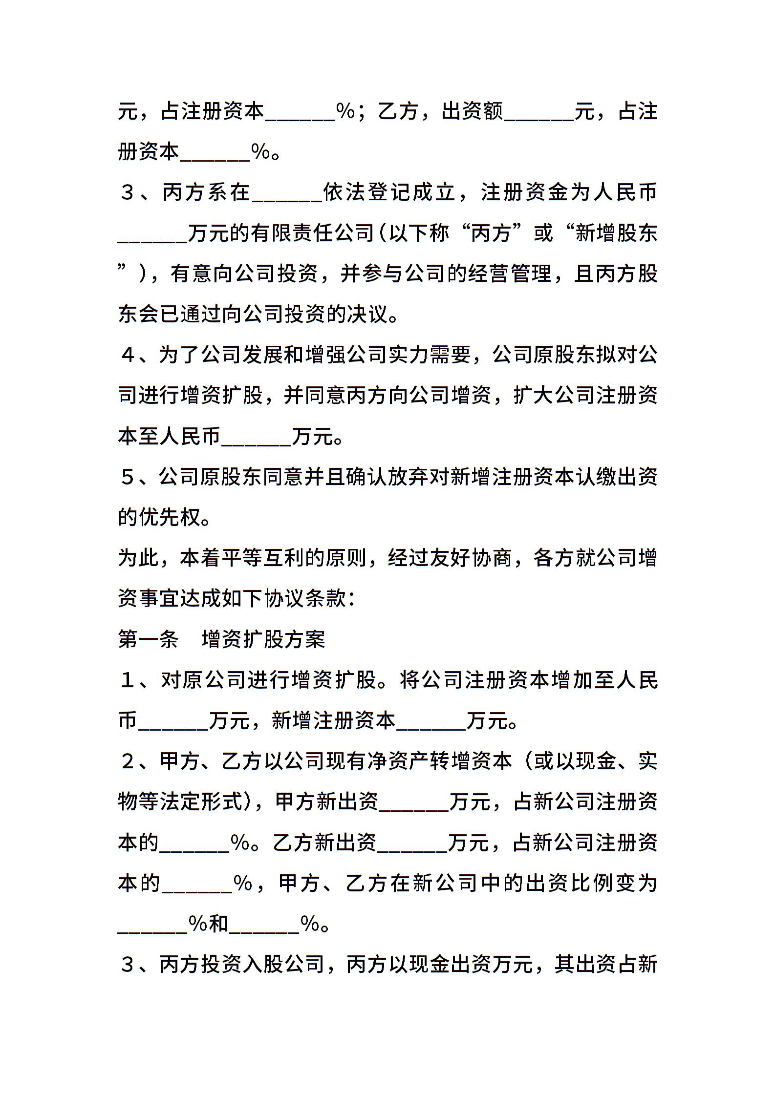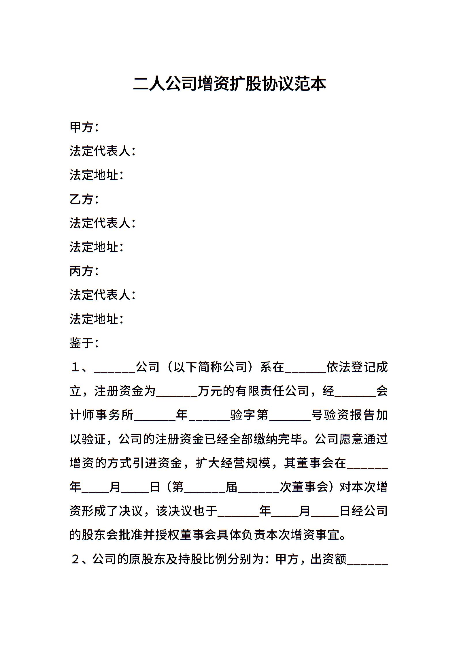 二人公司增资扩股协议范本