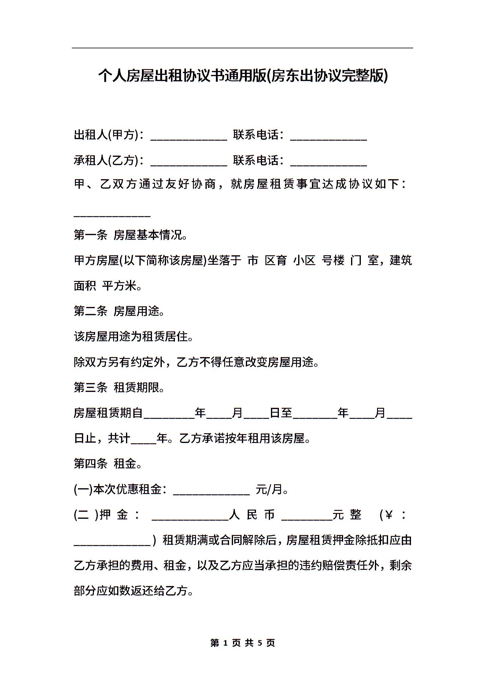 个人房屋出租协议书通用版(房东出协议完整版)